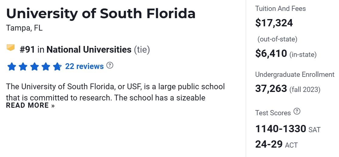 在2025年USNews美国大学排名中,USF位于第91名。