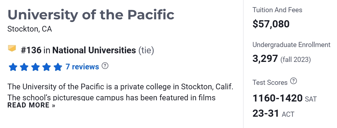 在2025年US News 美国大学排名中,University of the Pacific位于第136名。