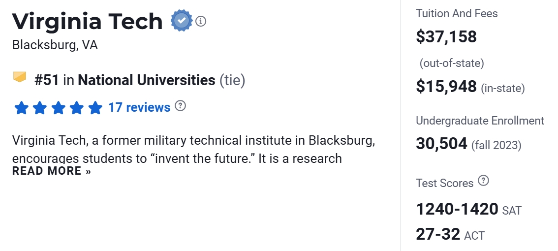 在2025 US News美国大学排名中,Virginia Tech位于第51名。