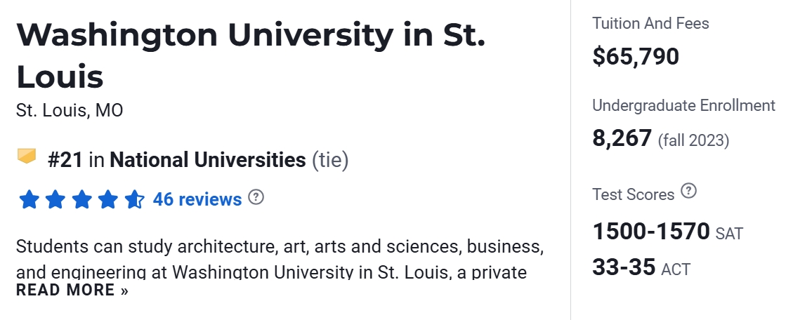 在2025 U.S. News美国大学排名中,Washington University in St. Louis位于第21名。