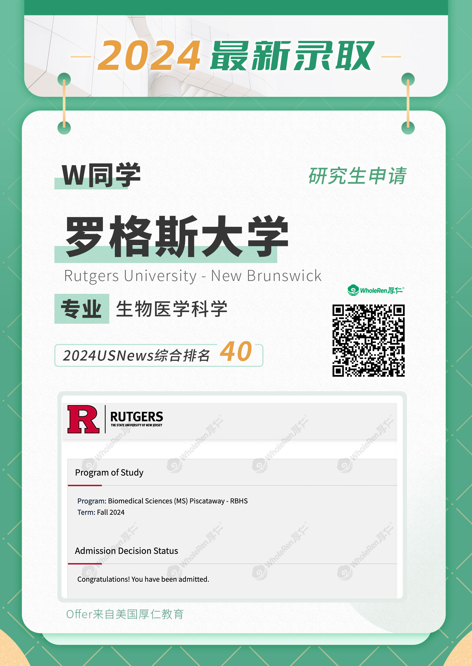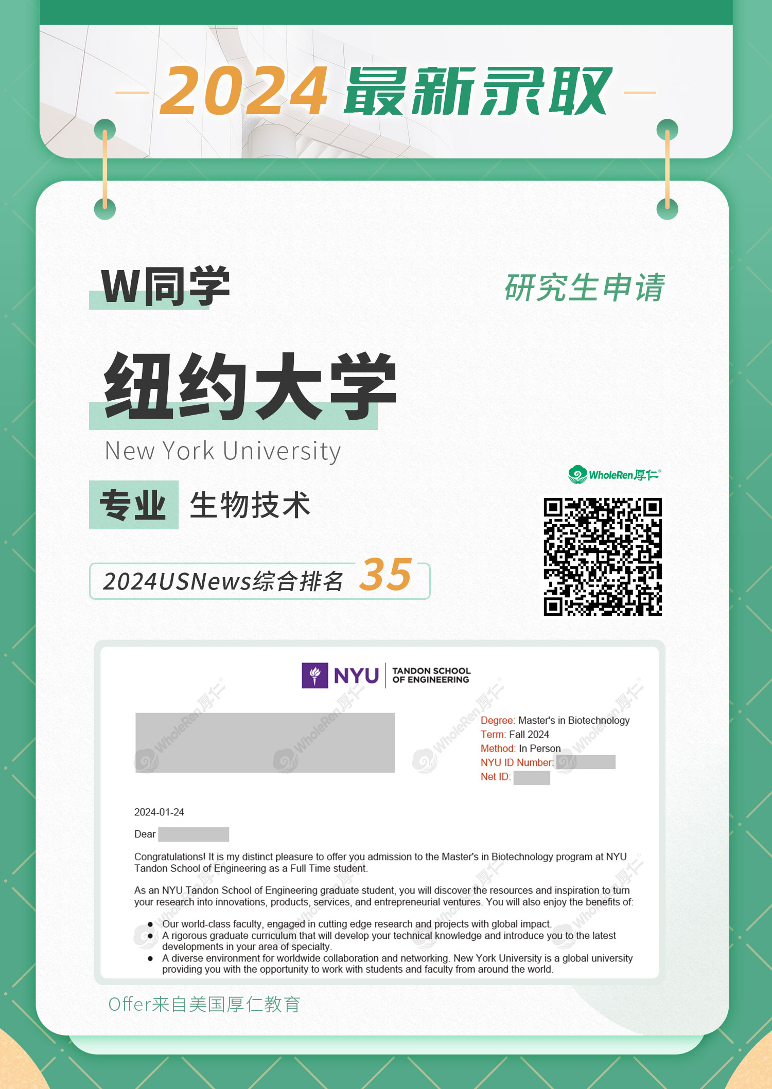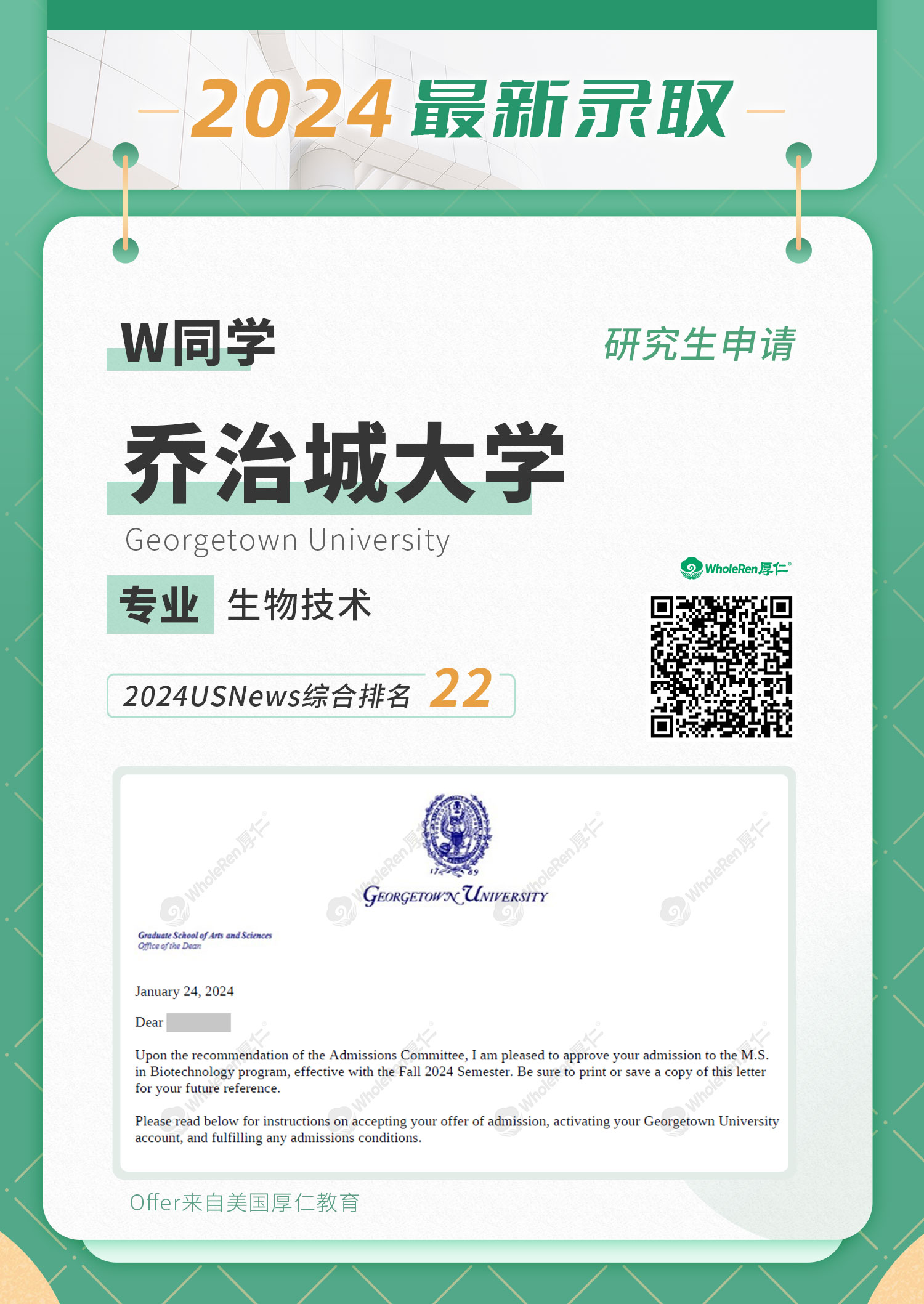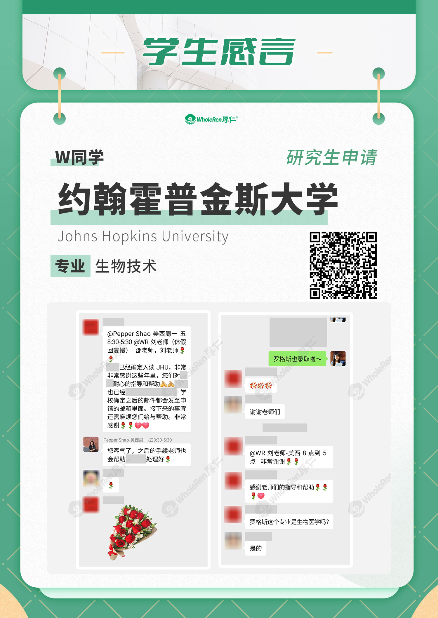 W同学大一就进入了厚仁本科转学服务,想要在本科期间完成跃升。但是,由于大一很不适应美国的学习,自己也比较贪玩,没有按照计划参与课外活动和提高GPA,最终转学服务变成了研究生申请。 由于疫情的影响,学生读本科用了四年半,疫情休学半年。学业规划方面,W同学每一年的选课和学习都有申请老师把关。专业选择方面,没有那么顺利,W同学想法比较跳跃,专业从最初的化学,换成了生物,中间还考虑过医学、物理等。临近申请截止日期,才最终决定走生物的方向。结合就业趋势,最终确定了生物信息、生物技术等专业。选校和选项目时,考虑到学生缺少编程和数学基础,厚仁团队推荐了对先修课要求不太严格的一些院校项目。课外活动方面,申请团队反复强调,多次沟通,让W同学认识到参与实习和科研项目的重要性,并成功指导W同学争取到了校内科研机会,以及完成了3段实习。文书方面,文书指导老师同样拥有生物医学背景,因此能准确帮学生抓住重点,结合过往经历,从专业角度突出W同学的申请优势。 最终W同学收获了约翰霍普金斯大学、乔治城大学、纽约大学等多个美国院校录取,学生和家长都非常满意。祝W同学前程似锦,学业顺利!
