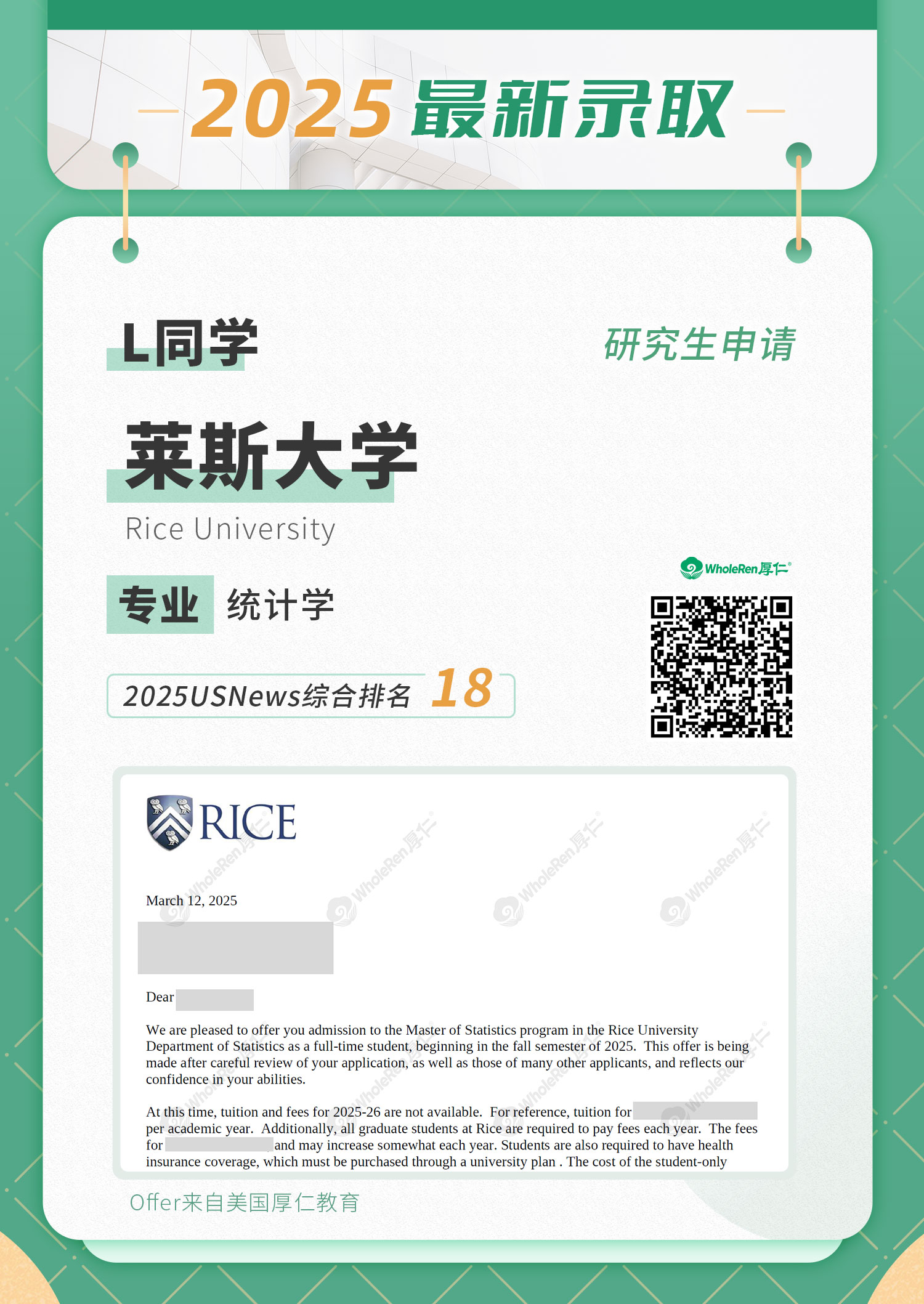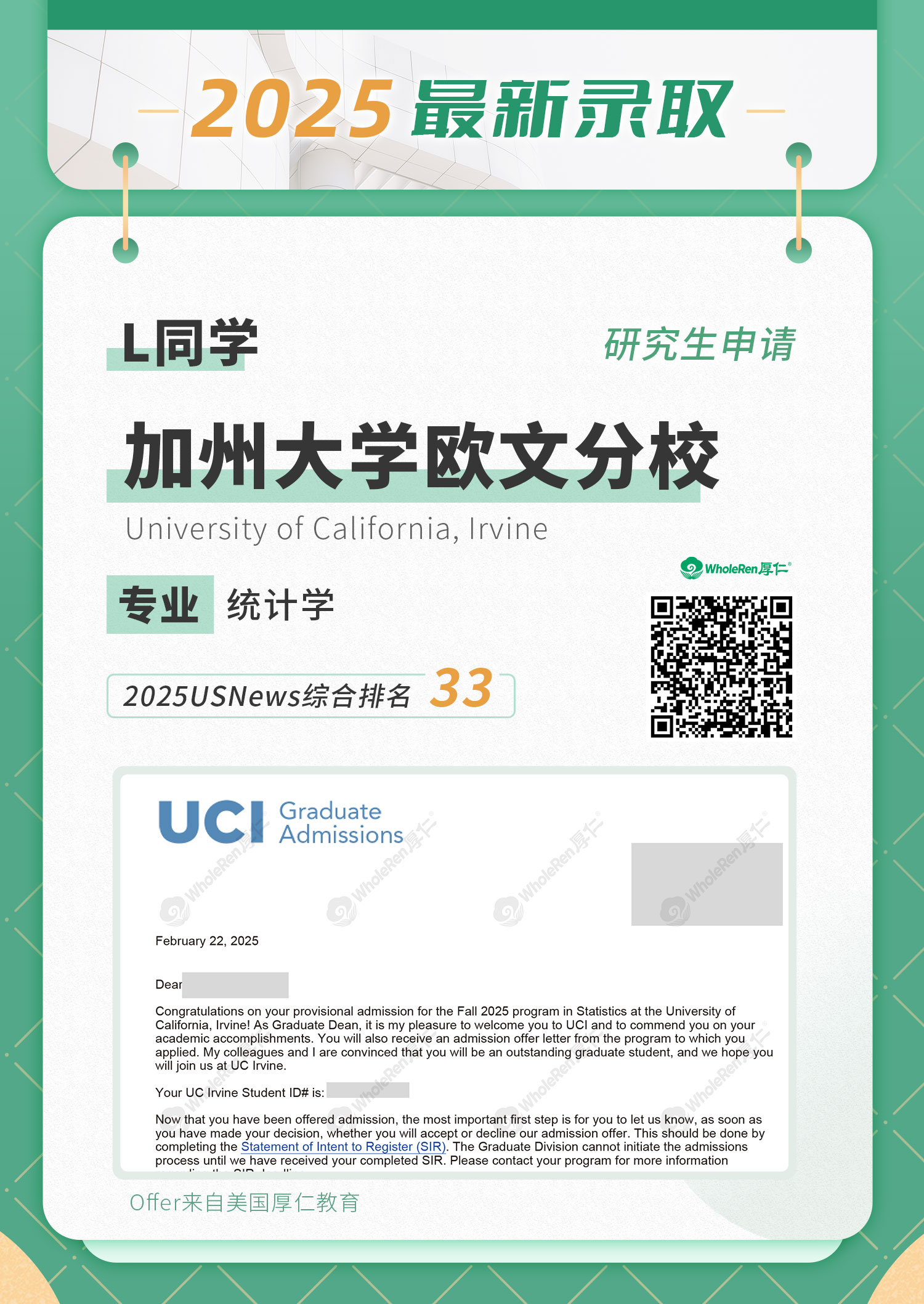 L同学就读于美国本科院校,GPA 中等3.5,而且本科课程难度较低,含金量不高,还有很多重修的经历;GRE330。L同学在申请阶段还曾遇到过学术危机,幸好成功进行了学术紧急申诉。在申请过程中,文书老师基于L同学的背景,帮助L同学不断优化个人陈述、文书Essay等,最大程度突出L同学的申请优势与项目匹配度。同时,申请老师还指导L同学在校外补充了编程相关背景,为L同学的文书内容提供了强有力的支撑。 最终,L同学收获了远超于预期的Offer,包括西北大学、UCD、UCI、UCR、莱斯大学、南加大、东北、乔治城等众多美国顶级院校的Offer!