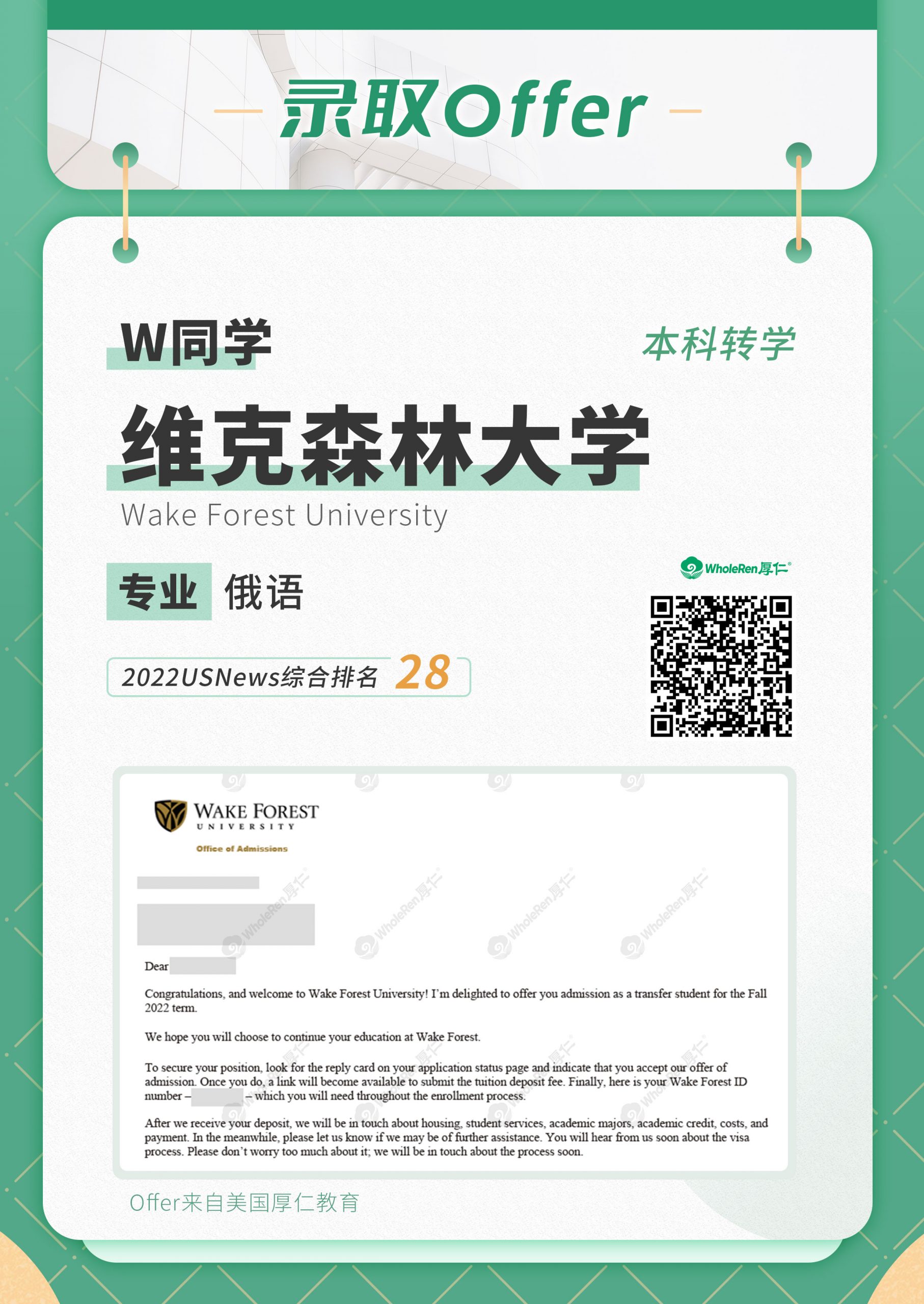 W同学虽然有美高经历,但是在申请本科时,尝试TOP20的名校,均失利。最终选择了一所文理学院的W同学,并没有放弃进入理想院校。W同学找到我们,进入了本科转学规划服务项目。
