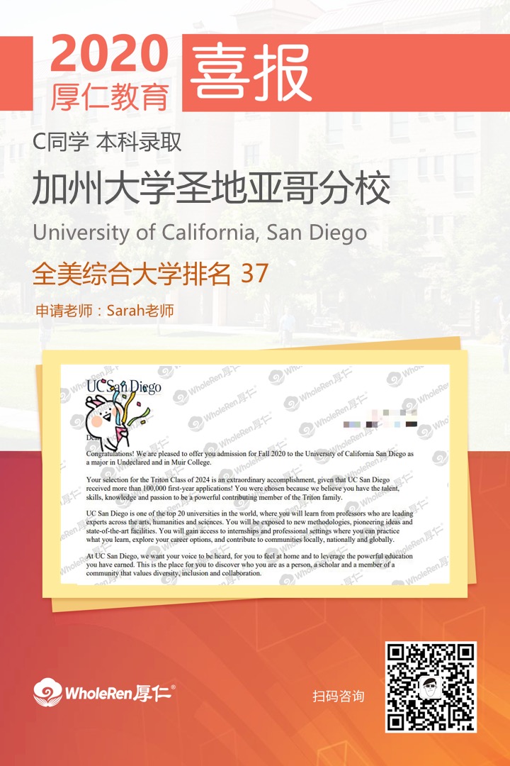 C同学初入服务时并不是那么的自信,经历过多次的SAT刷分,最终成绩依然锁定在1390(拼分达到1420)。在竞争日益激烈的本科升学大潮中,这个分数确实并不是很有竞争优势。 如何弥补呢?星空app官方网站手机版Sarah老师和楚博士在分析了C同学的综合情况之后,结合C同学突出的口语以及写作优势,建议C同学参加托福考试以弥补自己在SAT Reading & Writing部分的不足。同时在文书部分,重点突出了C同学的英语水平、尼泊尔支教的独特经历以及高于同龄人的思想境界。 最终C同学得以逆袭,在众多申请者中脱颖而出,一举拿到加州大学圣地亚哥分校、加州大学戴维斯分校、加州大学尔湾分校、佩普代因大学、波士顿大学、罗格斯大学、宾州州立大学、伊利诺伊香槟分校、康乃狄格大学的录取;同时也被放到了加州大学圣塔芭芭拉分校的候选人名单中。