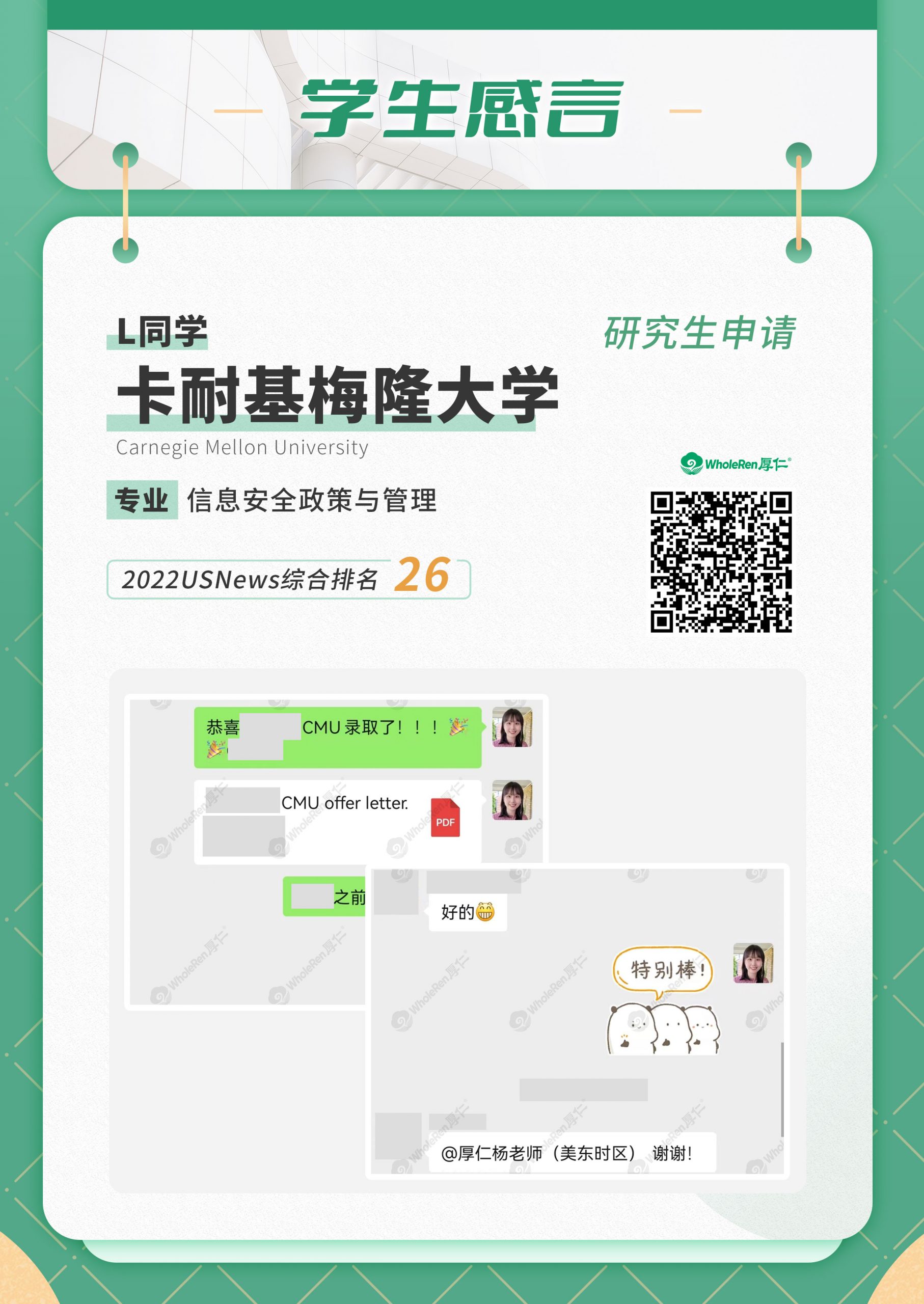 目前L同学收到了卡内基梅隆大学,波士顿大学,星空官网游戏等录取。祝贺L同学,厚仁团队将陪伴L同学一路前行!