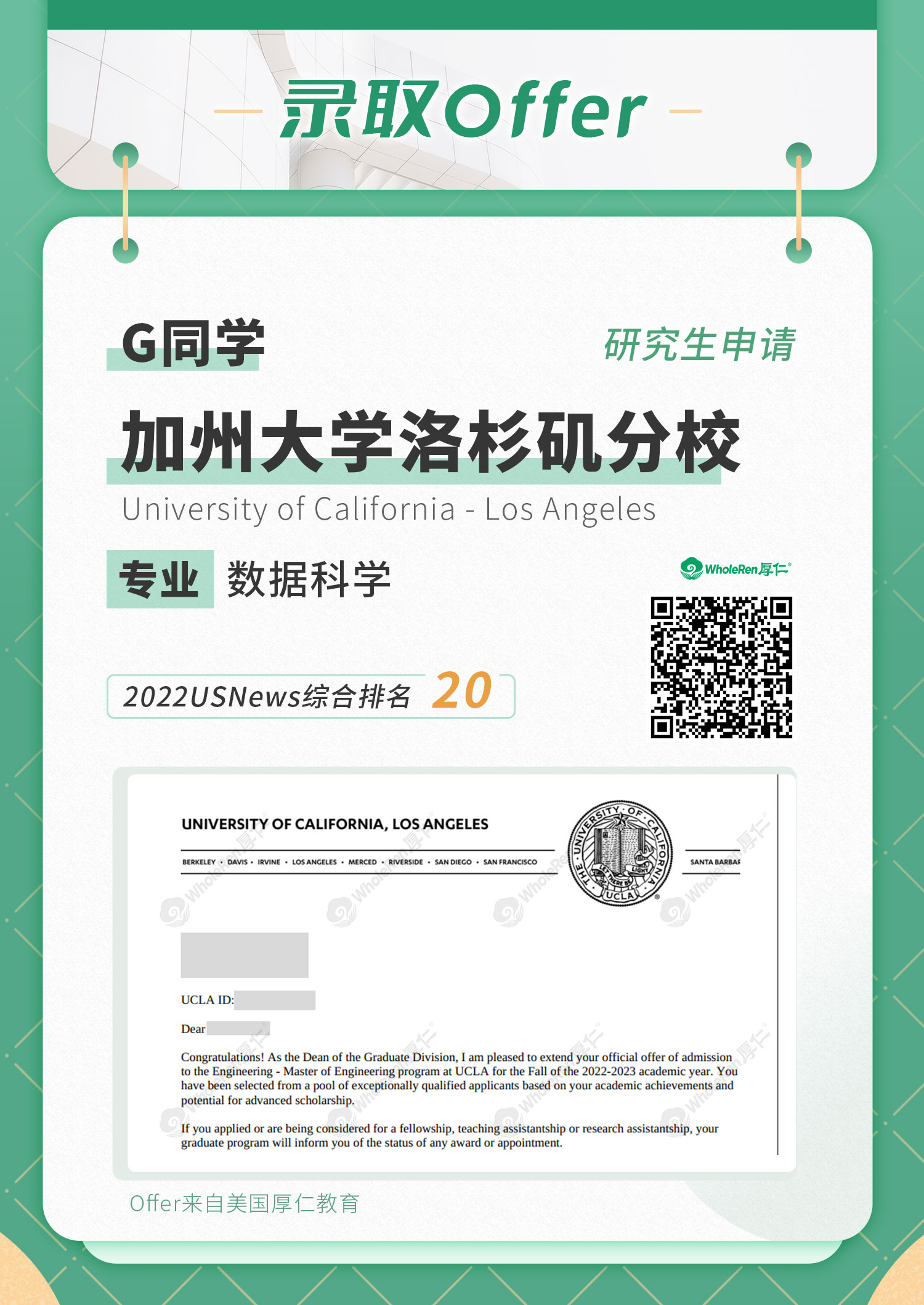 G同学是加州CC转UCLA学生,GPA3.6+,GRE325+,研究生申请目标是冲刺名校。 经过我们综合分析后,发现G同学大学所修课程含Java和C++。虽然与CS相关,但没有上过核心课程。而且,Data Science核心课程也不太多。所以在择校时,我们建议扩大申请专业范围,帮助学生探索更多可能性。背景活动方面,G同学坚持参加各类校内科研实习活动是十分值得肯定的,包括在校为期半年的Research Assistant和各类助教活动。为了增加专业相关活动,我们还为G同学规划了商业智能与分析的科研项目,并获得了导师的推荐信。这些丰富的经历,无疑为G同学的文书内容增添了专业相关度,同时也体现了G同学的个人特色。 让我们欣喜的是,G同学最终收到了哥大,JHU,UCLA等名校的录取!