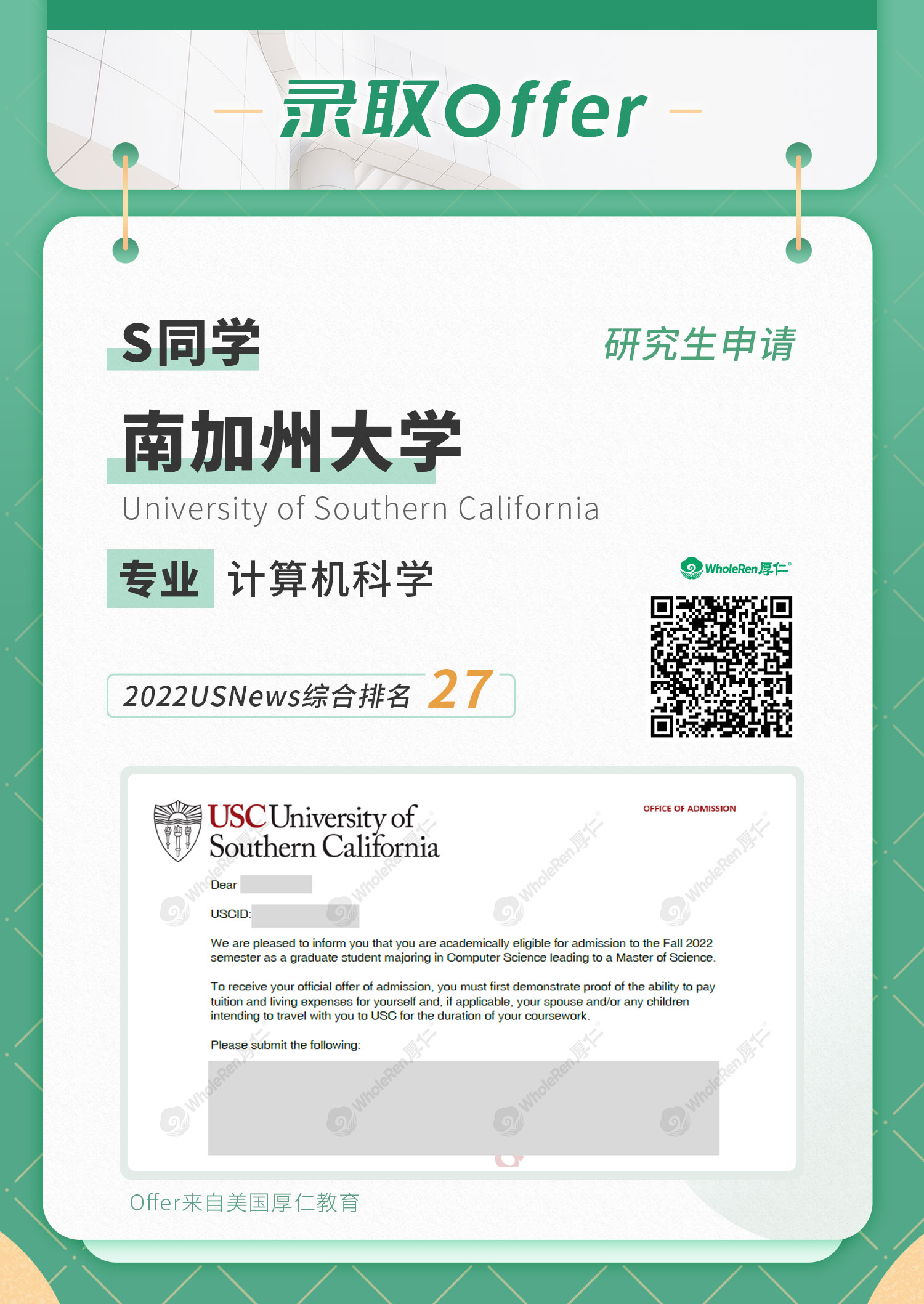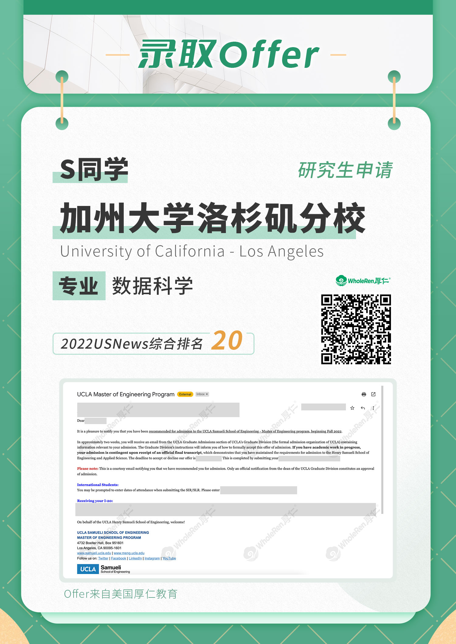 S同学就读于TOP20美本,研究生申请想要冲刺Top级名校,因此找到星空app官方网站手机版,希望得到专业的指导帮助。 厚仁导师经过分析,与项目往年录取学生对比,S同学的优势在于美本GPA高3.8+,且科研实习经历丰富。劣势在于实习科研和想申专业CS相关性不强,而且S同学的写作和口语表现较弱。这些均为美研申请增添了一些不确定性。 厚仁老师帮助S同学整理了适合她的冲刺院校并提供详细的申请建议。为了增加录取概率,建议S同学申请CS专业的同时,一部分也选择ORIE和DATA相关的专业。在这样的情况下,厚仁申请老师帮助S同学认真核对申请内容、修改文书,反复斟酌,修改探讨。 让我们欣喜的是,S同学最终收到了哥大,UCLA,UCB等名校的录取!