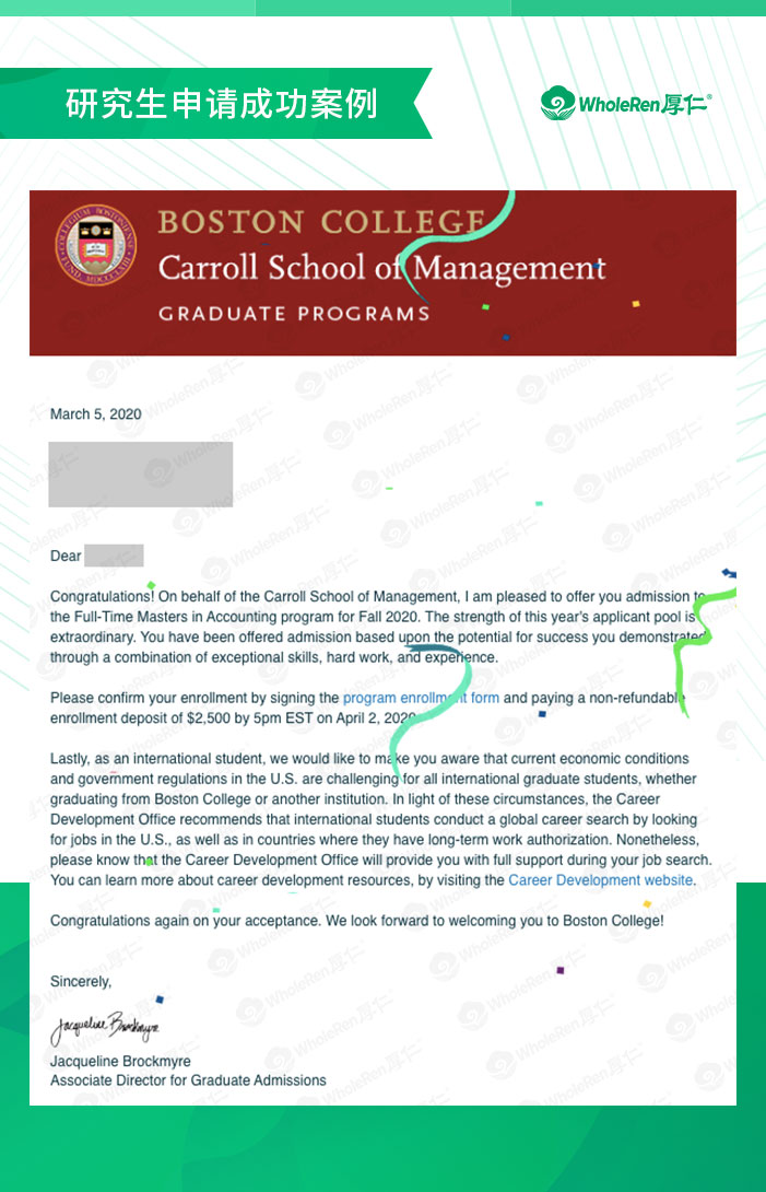 目前T同学已顺利收获加州大学欧文分校和波士顿学院的录取,还在等待其它院校的好消息。跨专业转学不要怕,厚仁助你一臂之力!