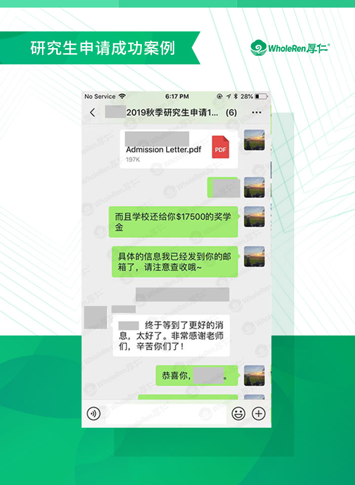 准备研究生申请时,在综合评估F同学的成绩和经历后,Zhijun老师认为F同学虽有开除经历,但GPA不错,且实习经历丰富,于是推荐了几所前30的学校作为冲刺。文书准备阶段,Zhijun老师和Shiyu老师查阅了大量申请专业的细节,在文书中加入相关的实习经历,丰富了文书的立体度和真实感。最终F同学成功斩获约翰霍普金斯大学,西北大学,南加大等众多名校录取。
