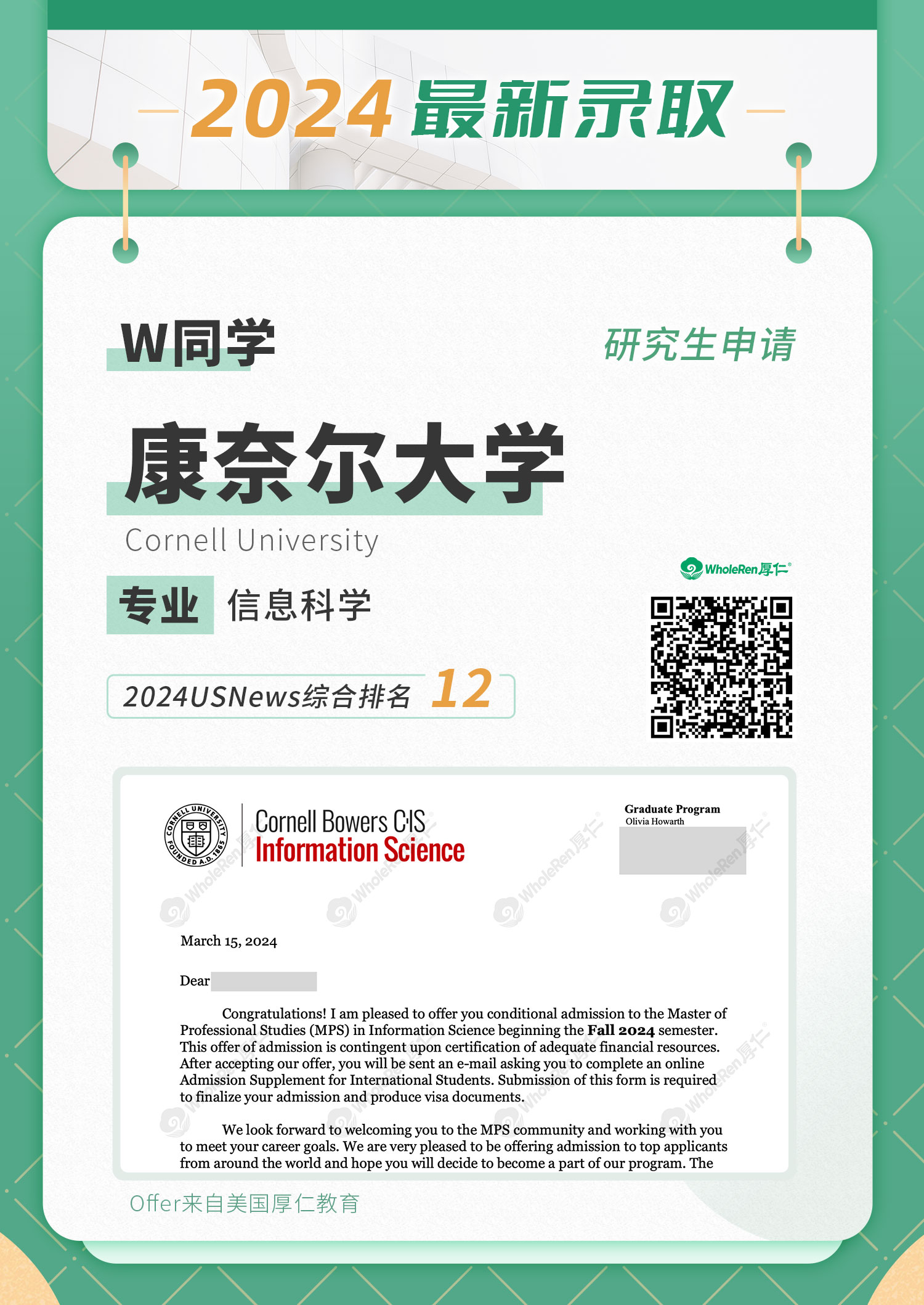 【Cornell】W同学混申专业经帮助准备后顺利获得梦校offer