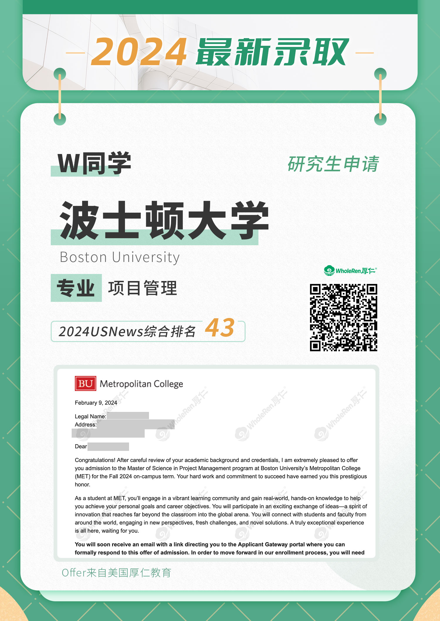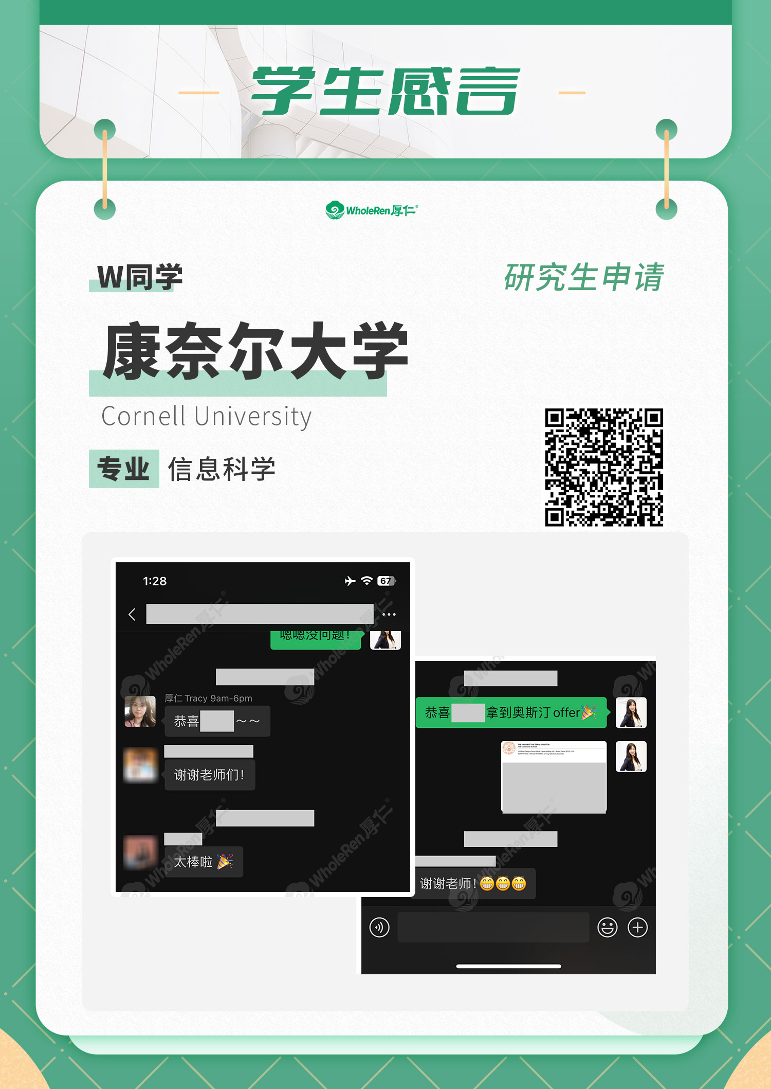 W同学在大三时,对自己未来的专业方向比较迷茫,在身边同学的推荐下,进入了厚仁的研究生服务,对于我们非常信任,愿意主动和老师沟通,所以最后的申请流程也很顺利。在厚仁团队的指导和分析下,W同学明确了自己的方向。申请老师将学生和家长的想法相结合,建议W同学采取混申专业的方式。 W同学是一名TOP60美本学生,专业是信息学,gpa3.6,拥有一段实习经历,以及一段创业经历。但是申请过程中,有几个跨专业申请,有一定难度。而且由于目标专业有交互设计,作品集需要完善,也没有GMAT/GRE成绩。 进入服务以后,我们积极跟进W同学的定制化选校进度,剖析实习及过往经历与所申专业之间关联,耐心辅导作品集的整理。在文书与推荐信方面,文书专家帮助W同学进行了框架梳理和文字指导,同时跟进推荐信进度,提高了W同学的申请竞争力。在面试前,厚仁老师也多次安排模拟面试,并给出有效的提升建议。 最终,W同学收到了康奈尔大学,德州奥斯汀,波士顿大学等梦校offer,申请结果理想,W同学非常感谢厚仁老师们的指导与帮助!