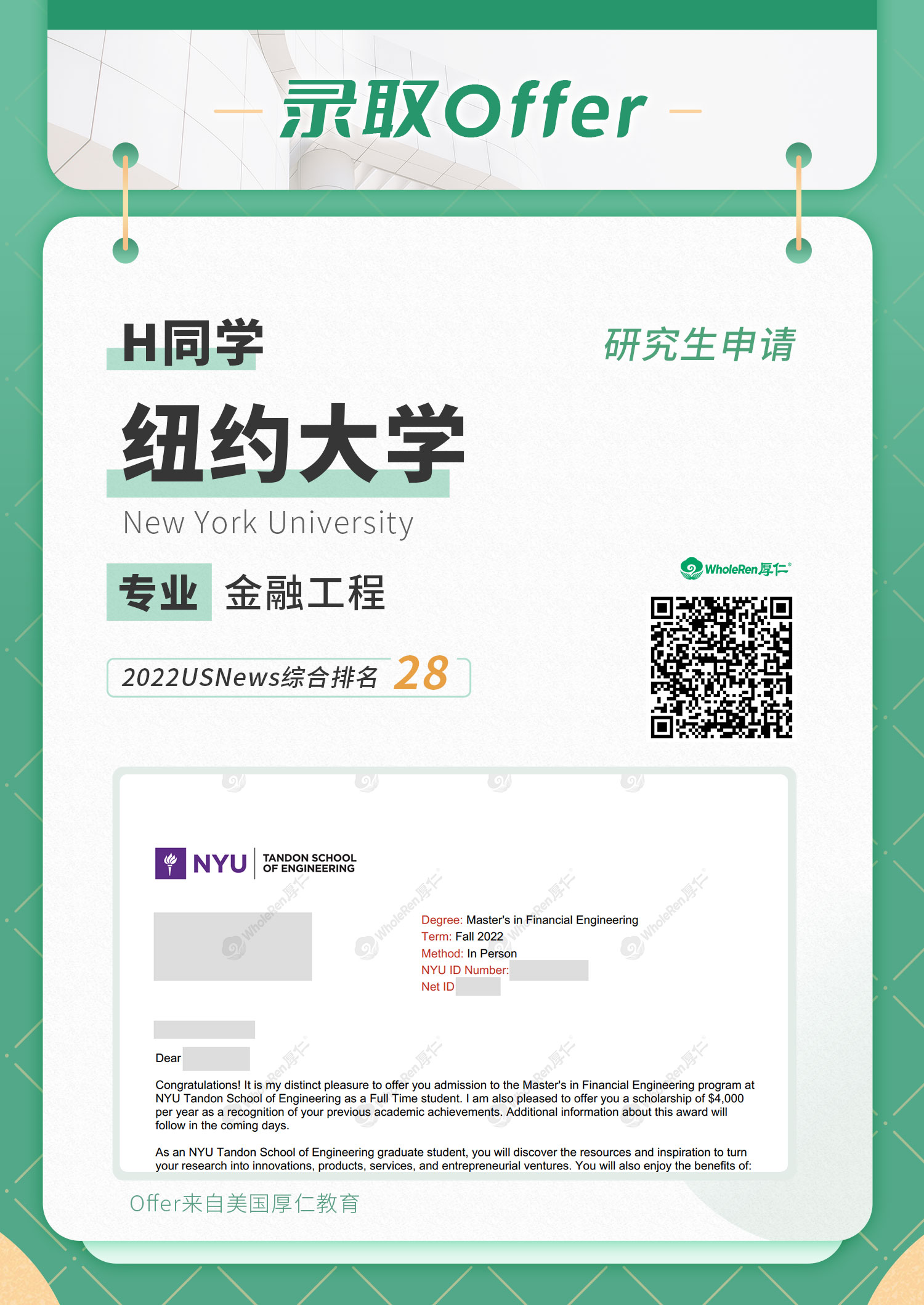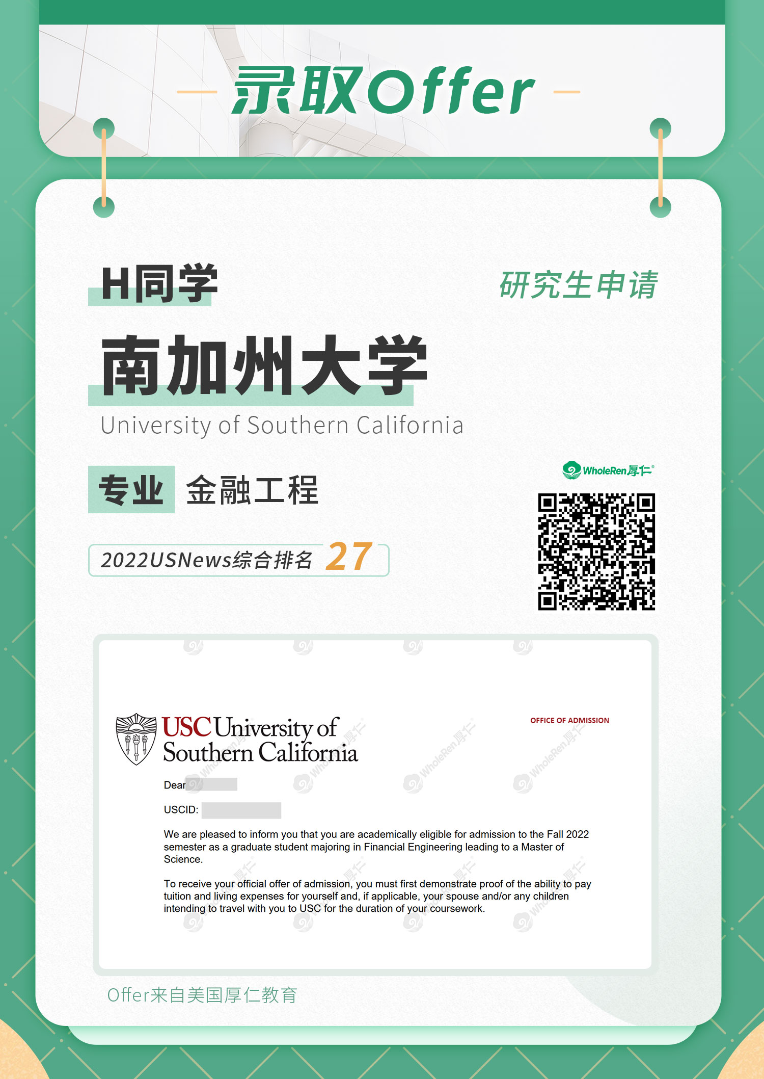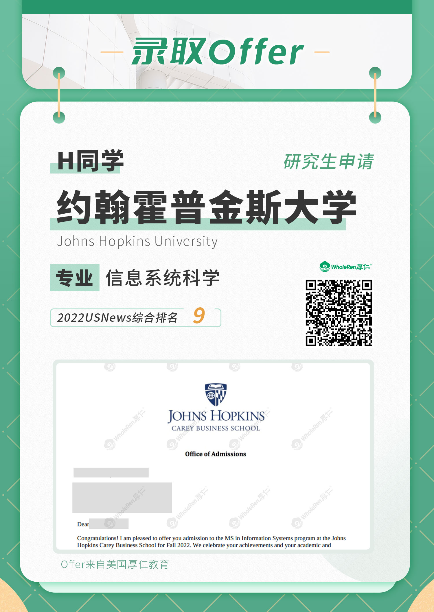 最终H同学成功斩获约翰霍普金斯大学、南加州大学、纽约大学等前30名校的录取!祝H同学前程似锦,厚仁将一路相伴!