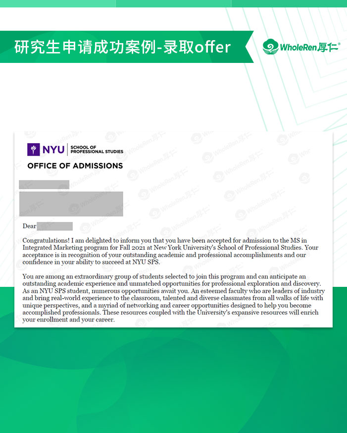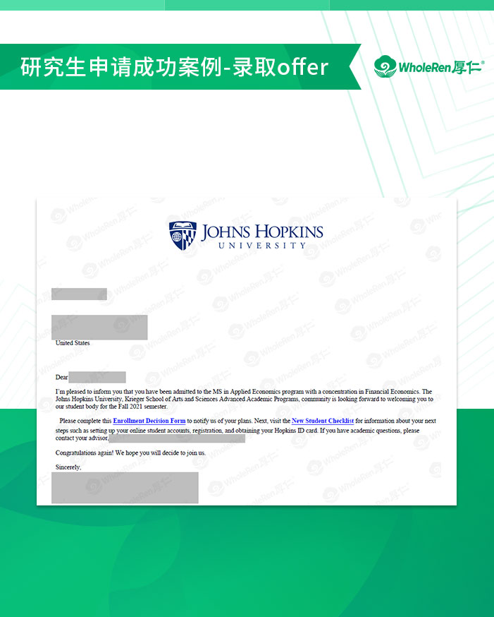 最终T同学不仅拿到了排名第10的约翰霍普金斯大学的录取,同时还拿到了雪城大学14000美金的奖学金。厚仁团队祝福T同学在今后的留学道路上一帆风顺!