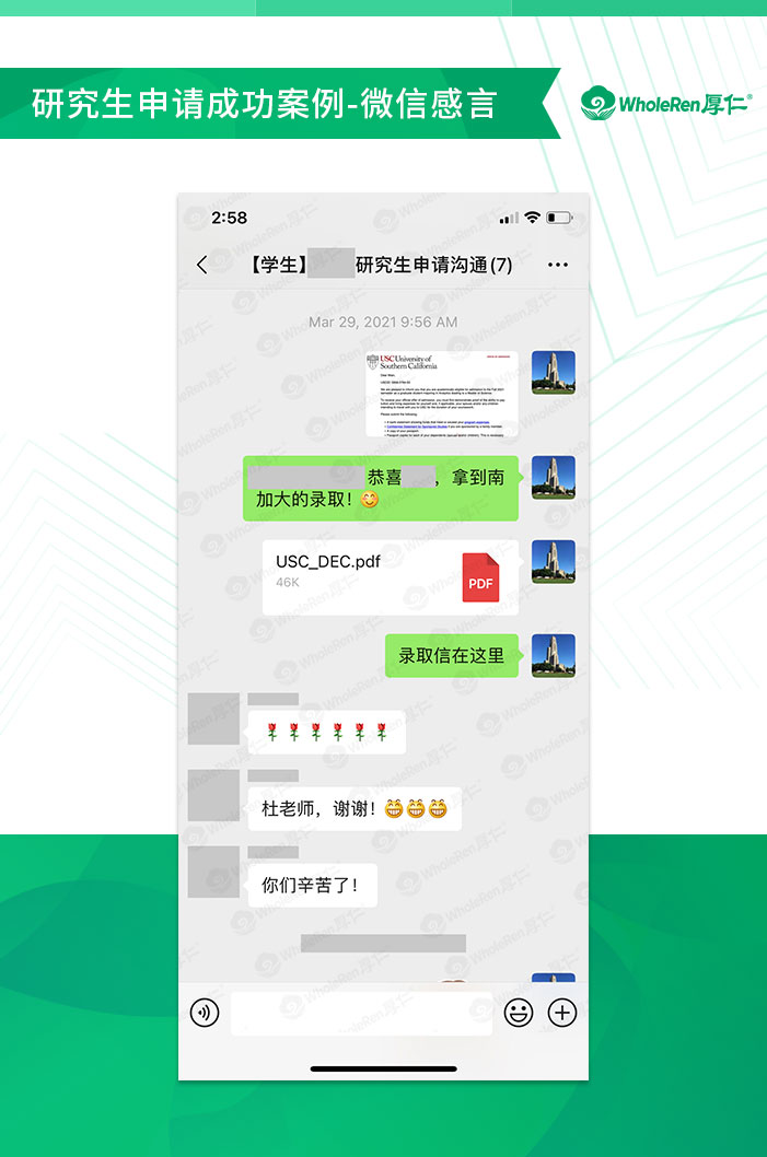 最终Z同学收到了包括约翰霍普金斯、南加州大学等多所学校录取。厚仁团队祝福Z同学在今后的留学道路上一帆风顺!