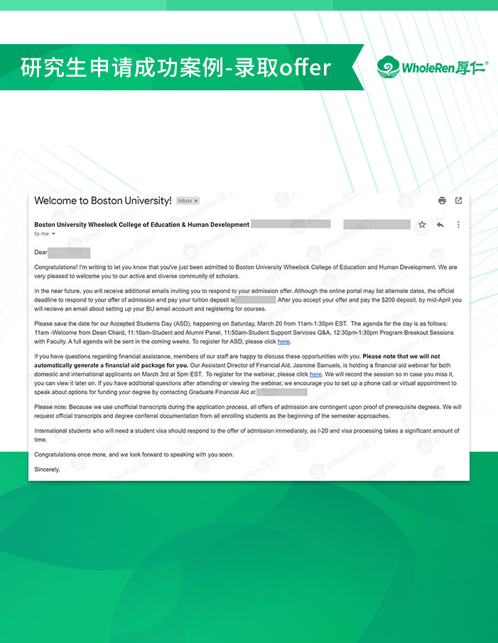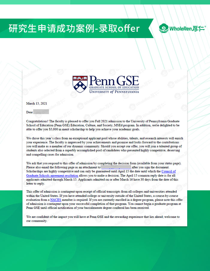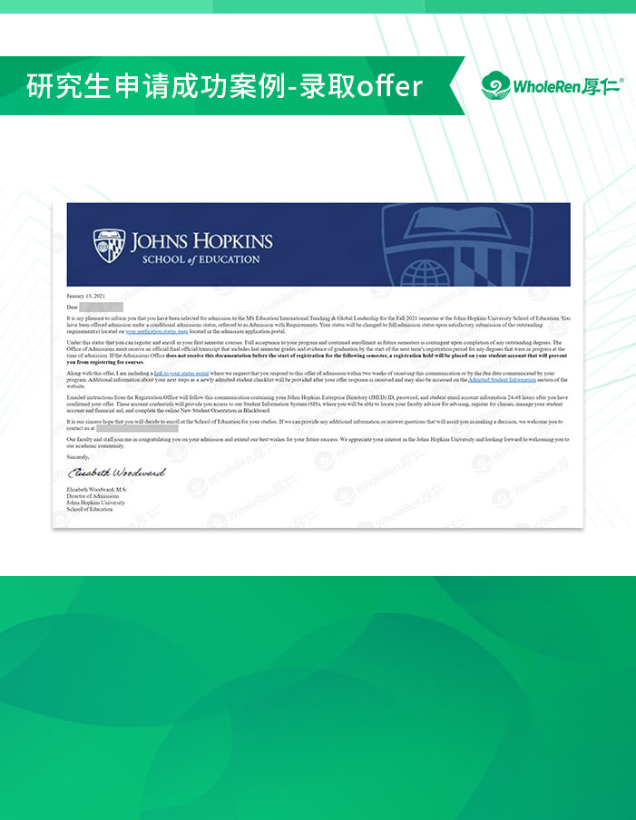 最终M同学接连获得藤校宾夕法尼亚大学和约翰斯霍普金斯大学等院校的录取。家长对厚仁团队的专业性给予高度认可,感谢之情溢于言表。M同学将开启新的学术生涯,祝愿一切顺利。