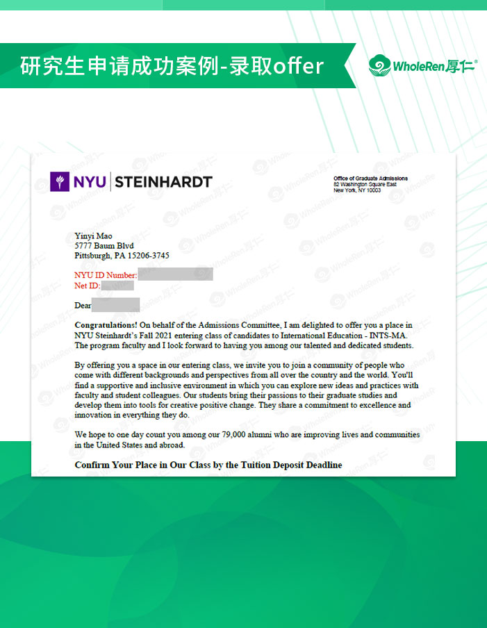 厚仁团队通过和M同学的充分沟通,M同学努力最终转学到理想本科院校,申研目标专业对口,为申请顶尖研究生院校奠定了基础。申研阶段在厚仁团队的指导下,M同学GPA提升到了相对理想水平,因没有GRE分数,在背景经历上提升自身的实力成为申请阶段的重点。M同学实习经历较丰富,但科研经历不足。我们建议学生补充国外科研经历,M同学积极参与最终拿到顶尖院校教授的推荐信,为申研加分不少。厚仁团队在文书中强调学生的实践经历,以弥补不足,并对学生进行了专业的面试培训,成为了学生获得理想录取的有力保障。