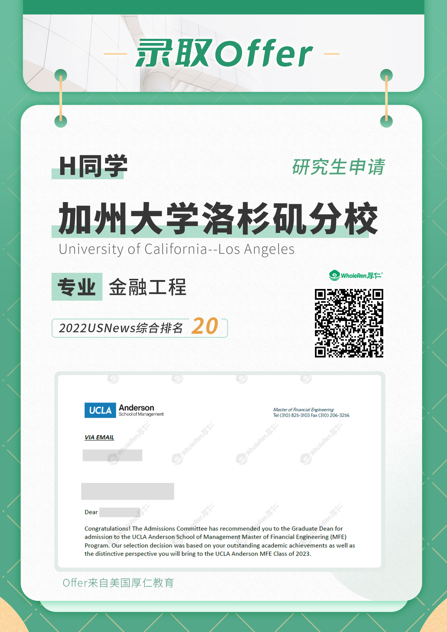 H同学就读于TOP25的美国大学,GPA4.0,GRE325+。个人申请优势十分明显,同时H同学对研究生的申请目标也十分明确,申请TOP 10院校。