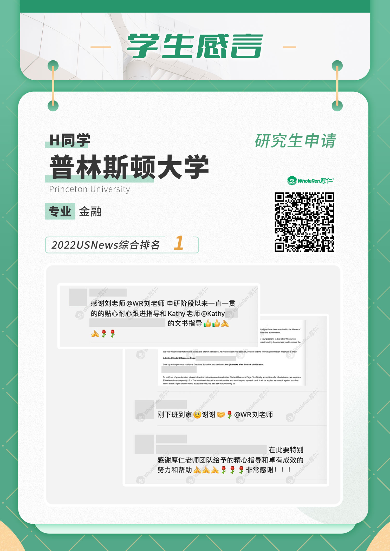 让我们欣喜的是,H同学收到了普林斯顿大学,MIT,哥伦比亚大学,斯坦福大学等TOP10名校offer!祝愿H同学在求学道路上扬帆远航!
