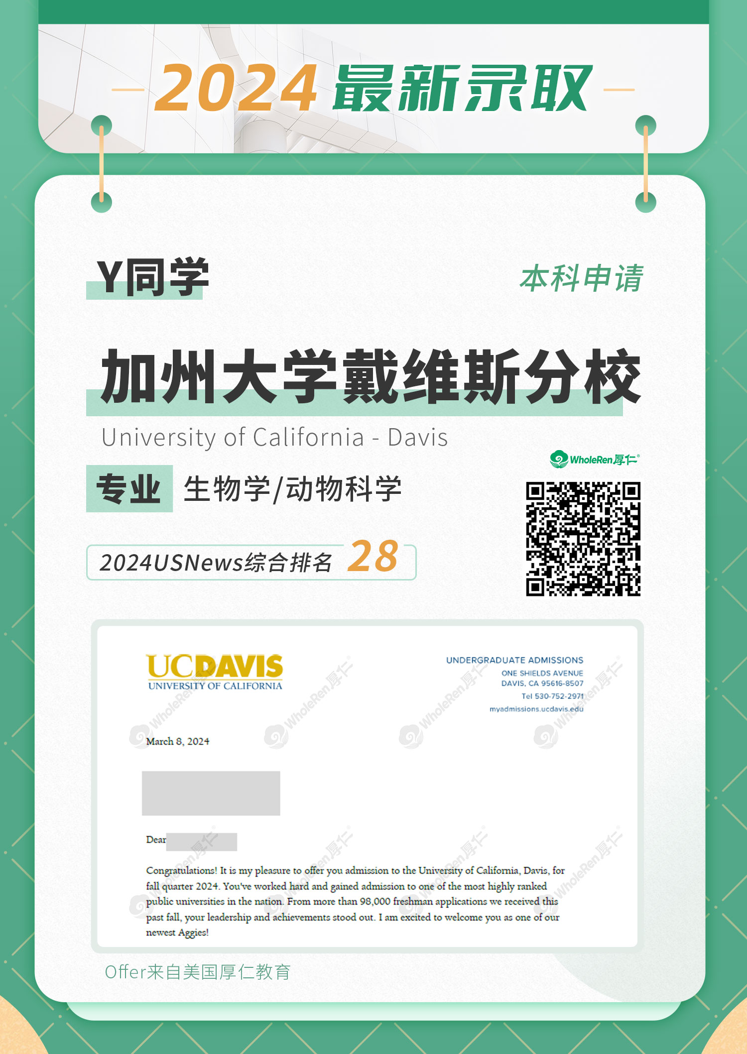 最后,经历了2年的规划合作,学生录取到兽医专业第一的加州大学戴维斯分校, 还有其他的动物科学和生物强校,UCSD、UF、Wisconsin Madison、OSU、马里兰大学、UIUC。恭喜Y同学,2年的积累和沉淀,让你明确的自己的方向,也收获了梦校的Offer!未来的留学道路,星空app官方网站手机版也将继续一路相伴!