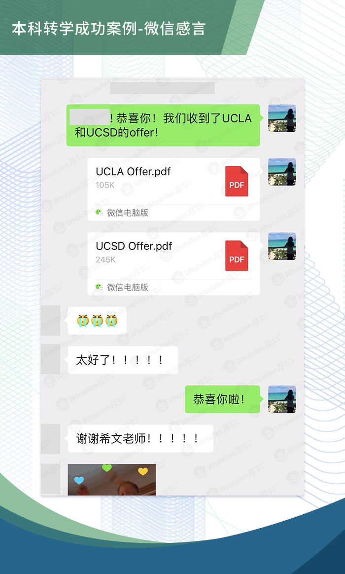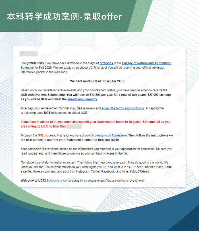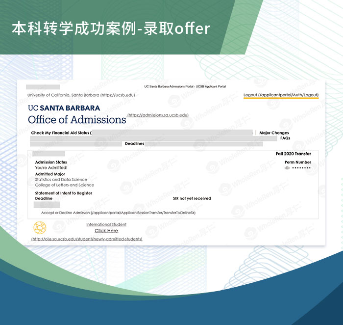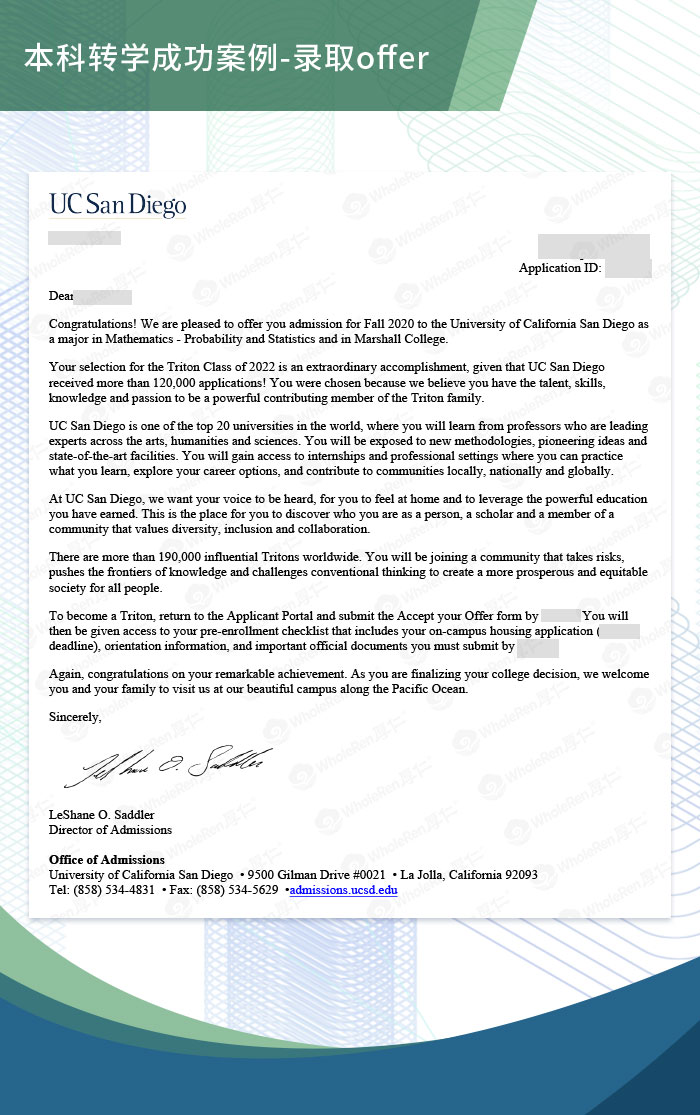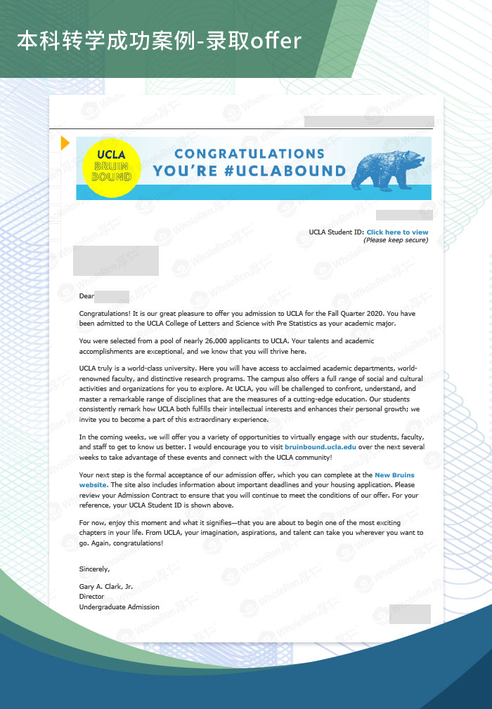 录取结果:加州大学洛杉矶分校 UCLA 罗切斯特大学 UR 加州大学圣塔芭芭拉分校 UCSB 加州大学尔湾分校 UCI 加州大学戴维斯分校 UCD 加州大学圣地亚哥分校 UCSD 威斯康星大学麦迪逊分校 加州大学圣克鲁兹分校 UCSC 加州大学河滨分校 UCR