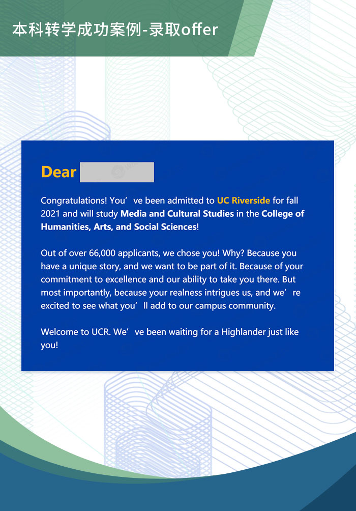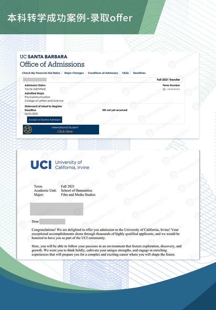 最终F同学获得了包括加州大学圣塔芭芭拉分校、尔湾分校在内的多所大学录取。实现了本科阶段拿到梦校学位的目标。厚仁团队建议学生抓住转学契机,要尽早开始转学规划,避免先修课程不足的情况发生,愿所有学生都可以实现梦校目标。