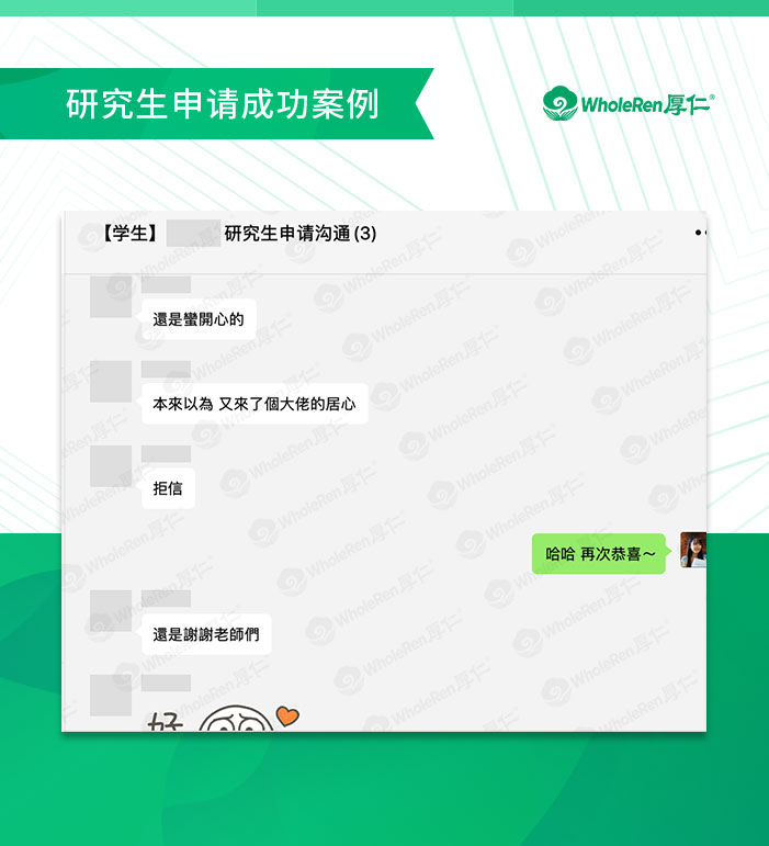 初始的GRE成绩较低,但T同学相信自己可以拿到更高的分数,在递交申请后又考一次,拿到了330分的好成绩。但那时已过申请截止日期,好在厚仁老师一直和招生官保持规律沟通,学校最终接受了T同学更新的GRE成绩,这对录取结果带来了很大的帮助。