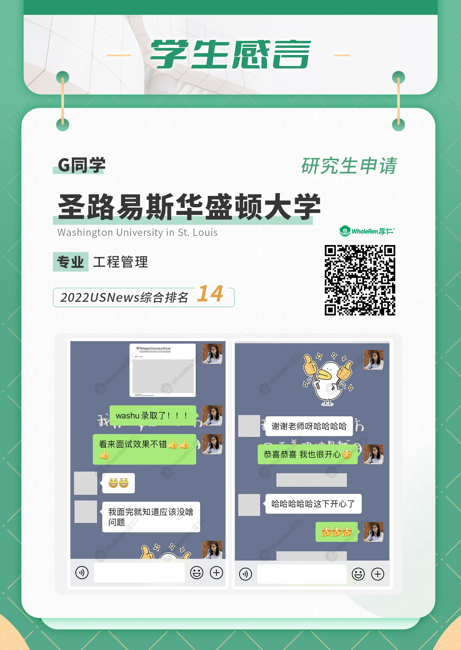 最后,G同学获得了排名14的圣路易斯华盛顿大学的录取offer,祝愿G同学未来学业之路一切顺利!