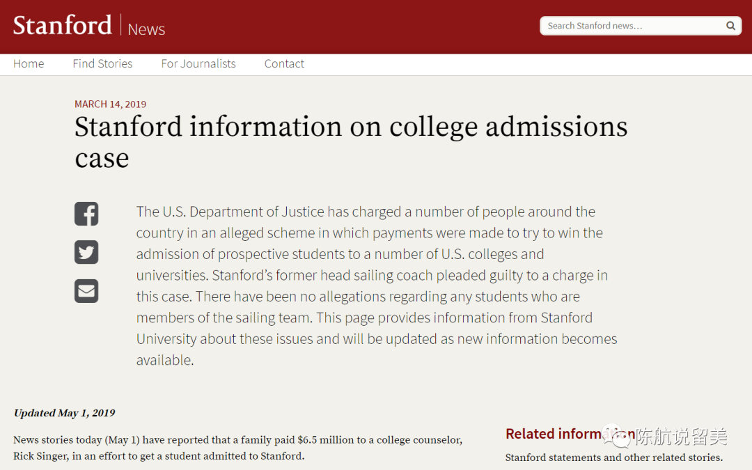 去年,中国家长卷入斯坦福贿赂一事闹得沸沸扬扬,一方面校方面表示对贿赂并不知情,开除赵同学全然是因为发现其申请材料造假,而另一方赵同学那边则表示以为是合法的捐款,并不知道钱被用于贿赂。