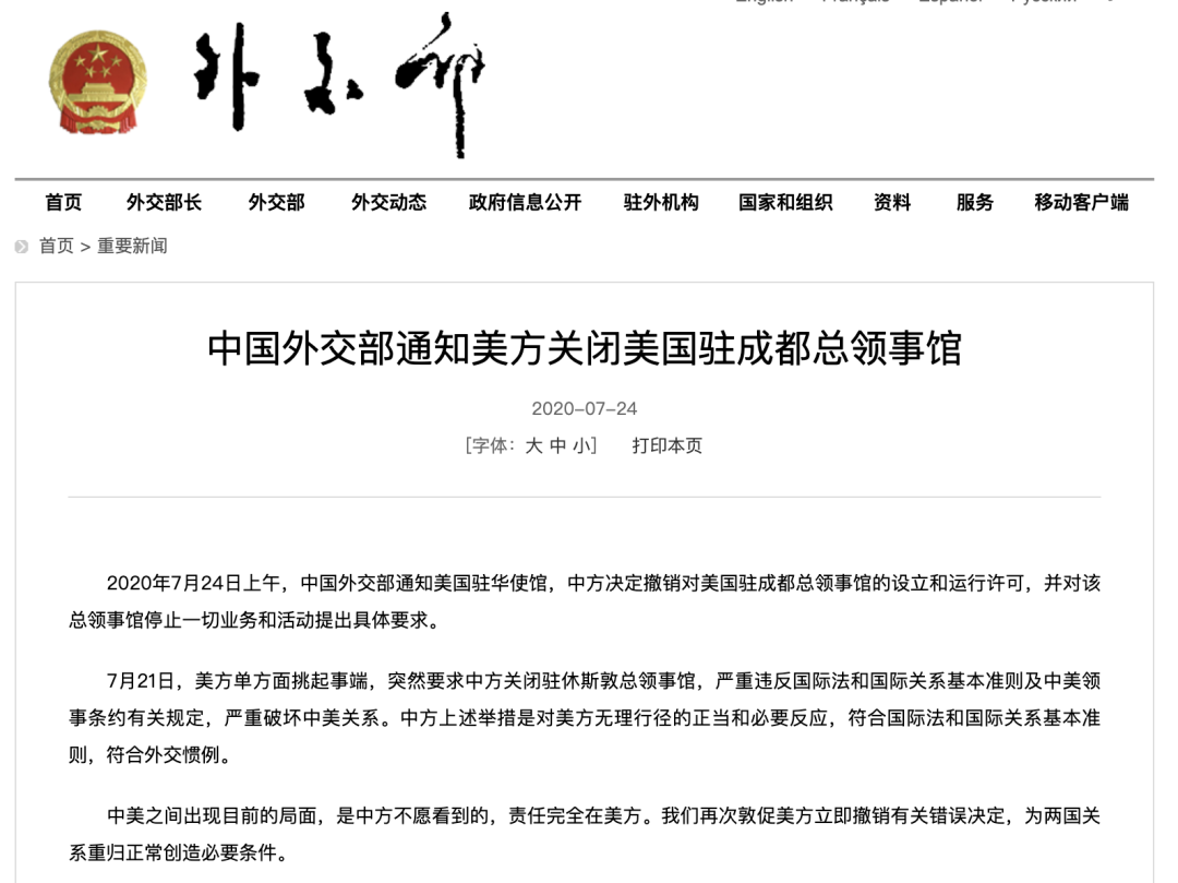 2020年7月24日上午,中国外交部通知美国驻华使馆,中方决定撤销对美国驻成都总领事馆的设立和运行许可,并对该总领事馆停止一切业务和活动提出具体要求。7月21日,美国单方面要求中方关闭休斯顿总领事馆,中国的举措是对该行径正当和必要的反应。详情请查看外交部官网页面截图: