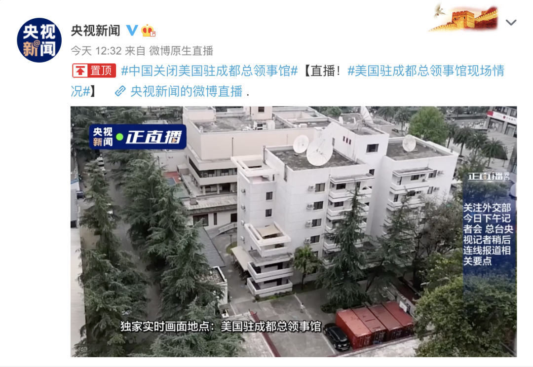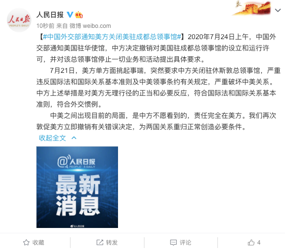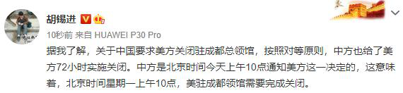 《环球时报》总编辑胡锡进在微博上说:“中国外交部今天要求美方关闭驻成都总领馆。按照对等原则,中方也给了美方72小时实施关闭。中方是北京时间今天上午10点通知美方这一决定的,这意味着,北京时间星期一上午10点,美驻成都领馆需要完成关闭。”