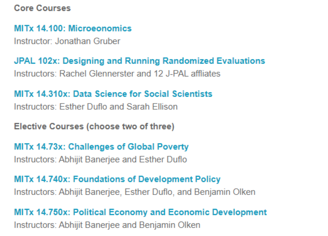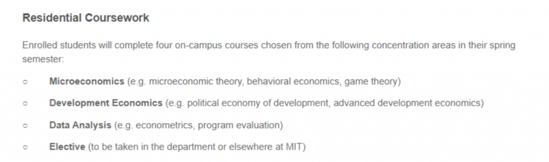 那么,是什么样的五门课,可以让学生充分准备好DEDP项目所需要的背景知识且筛选海量的申请者呢?三门必修课分别是微观经济学,随机分析,和数据科学,两门选修课可选的有全球贫困问题,发展政策基础,以及政治经济学。光看名字可能觉得比较容易,但就是这五门课的分数,与其他申请材料一起决定了学生是否会被录取。