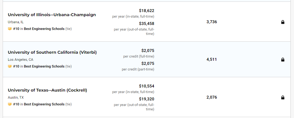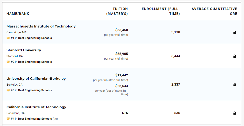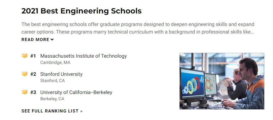 从工程学院的排名结果来看,还是麻省理工学院、斯坦福大学、加州大学伯克利分校占据了排名前三名的位置。最佳工程学院的前三名就没变过。