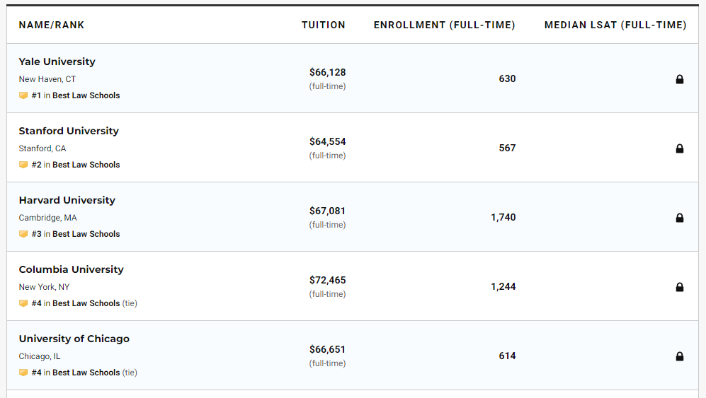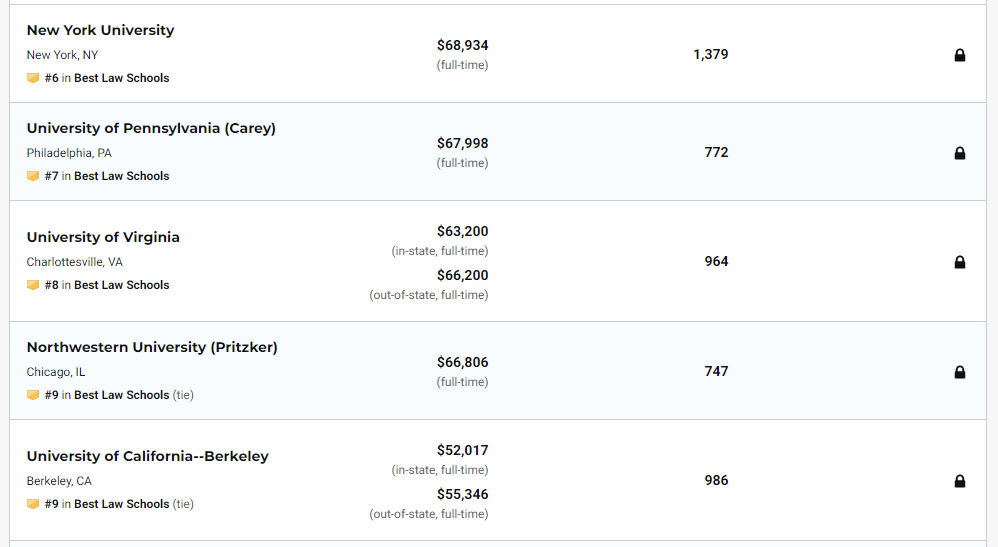 看了法学院的排名,虽然今年最佳法学院排名TOP与去年略有差别,但TOP5院校仍然是以下几所: