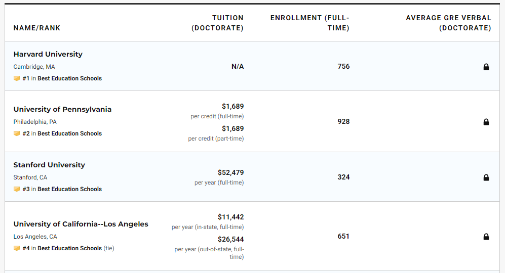 在今年的研究生教育学院排名中,前三名与去年一样,哈佛大学排名第一,宾大排名第二,斯坦福大学排名第三。
