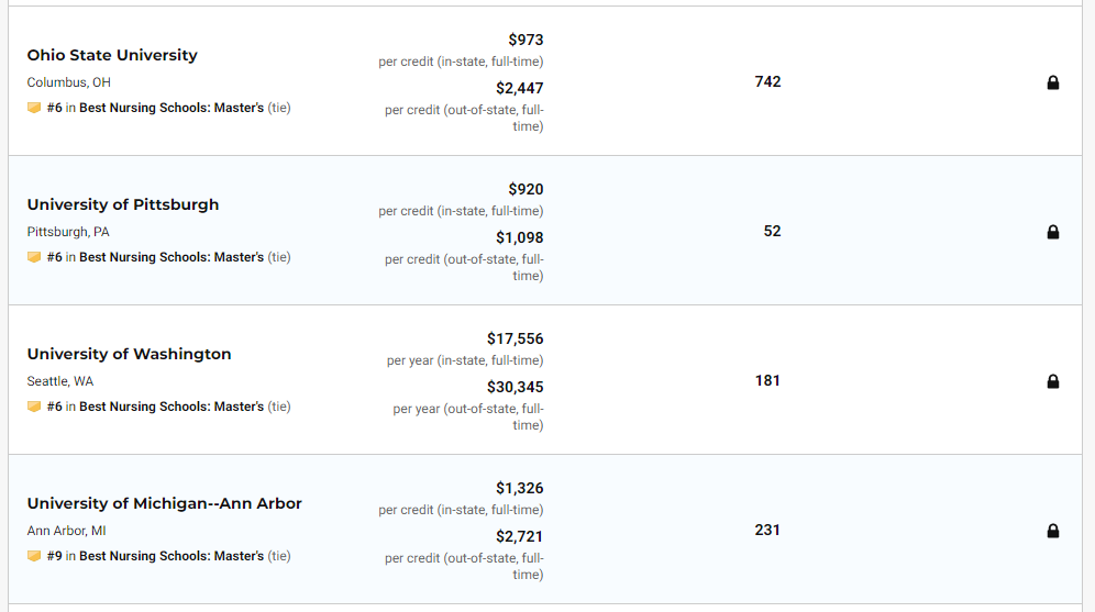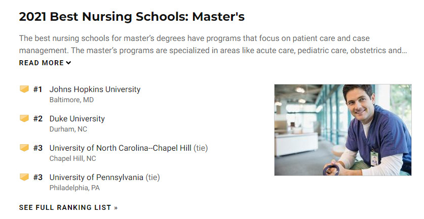 2020最佳护理学院的前两名,仍旧是约翰霍普金斯大学和杜克大学,北卡教堂山分校与宾大排名并列第三。