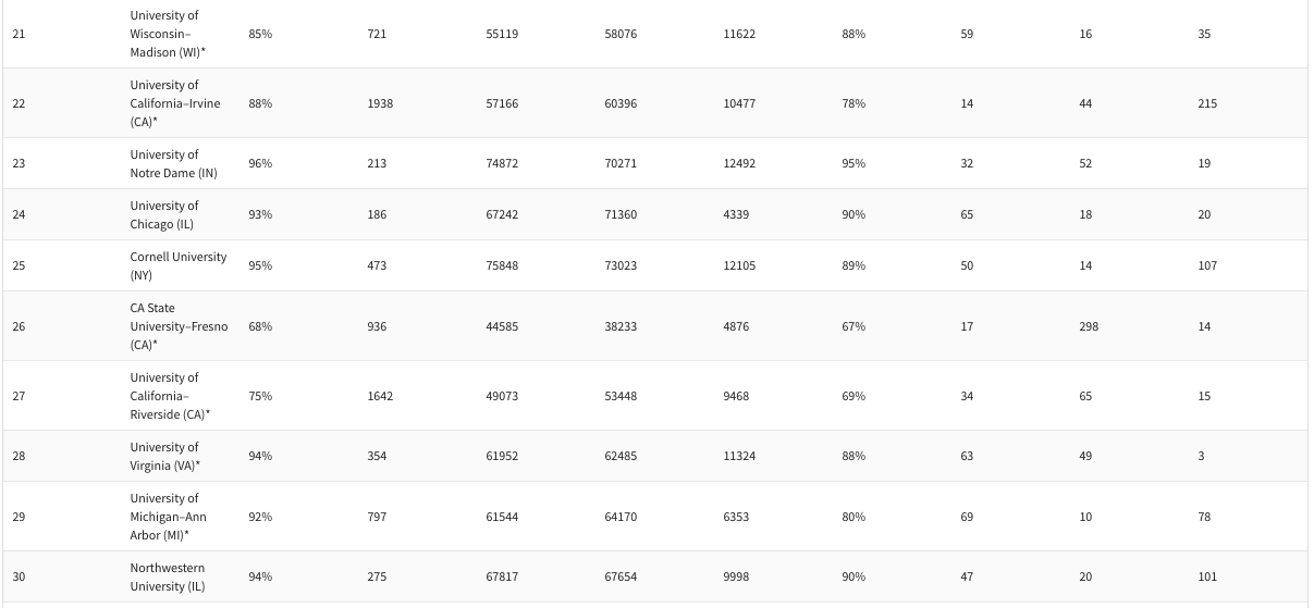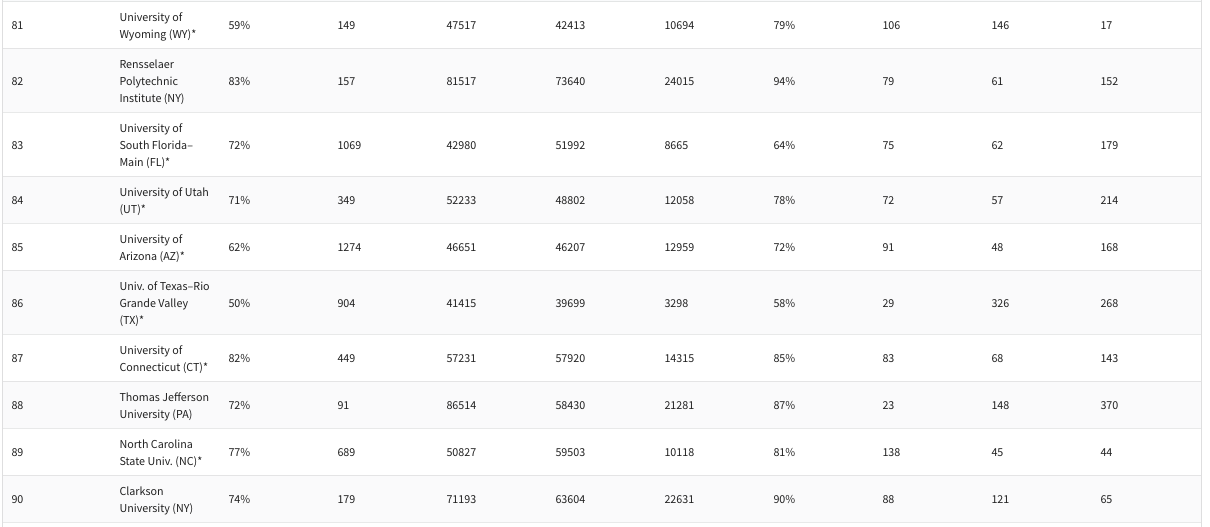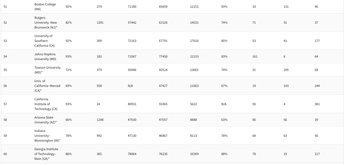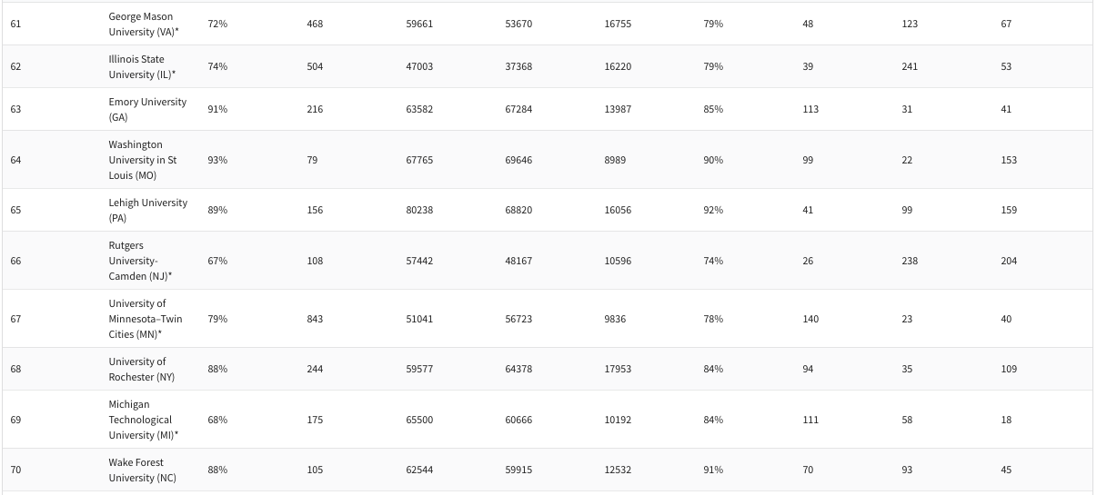 其实很多大家的私立“梦校”都在这份榜单中排名非常靠后。比如USC的排名是53名,Emory是63名,华大圣路易斯是64名,维克森林是70名,CMU甚至排到了第79名。