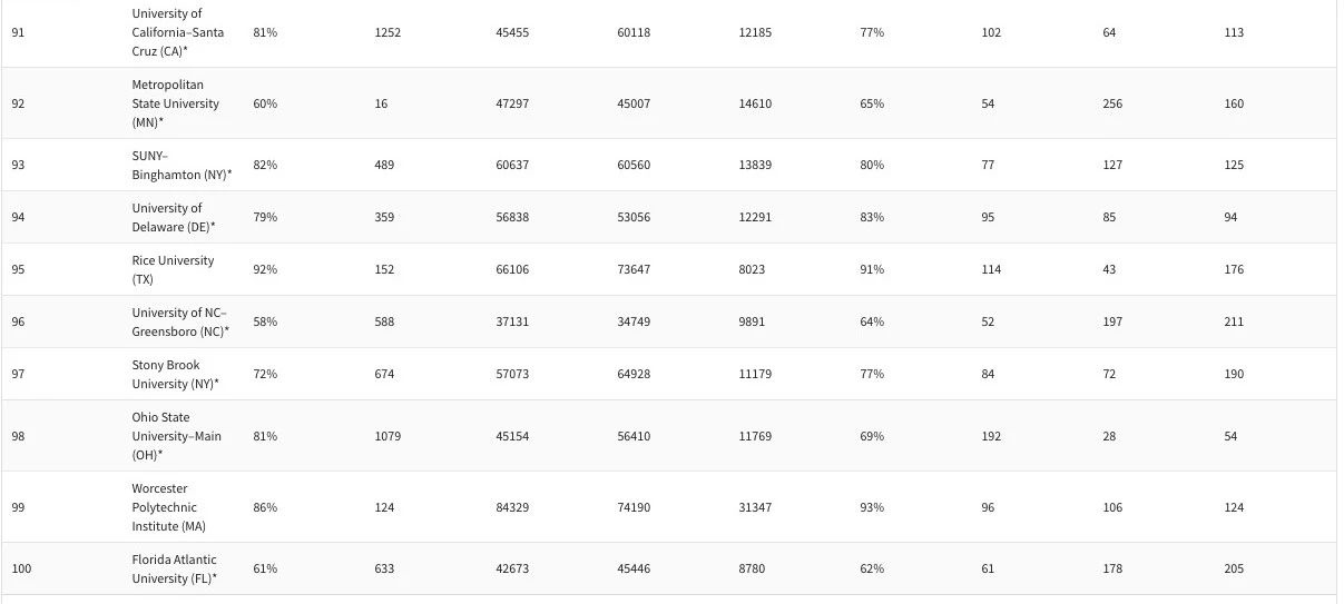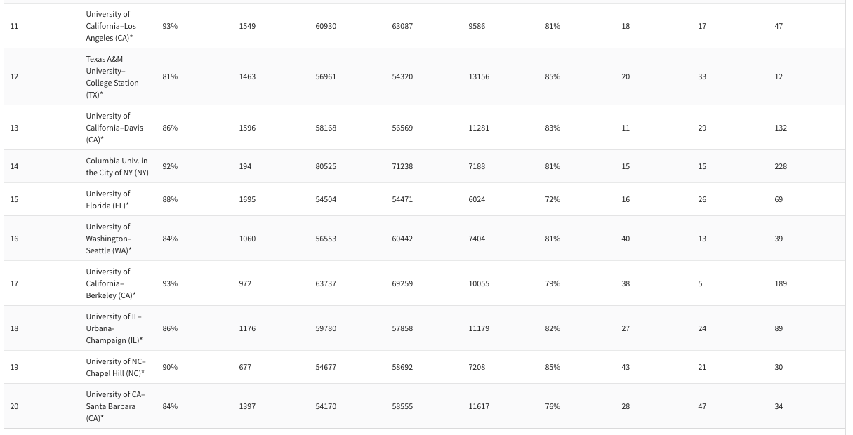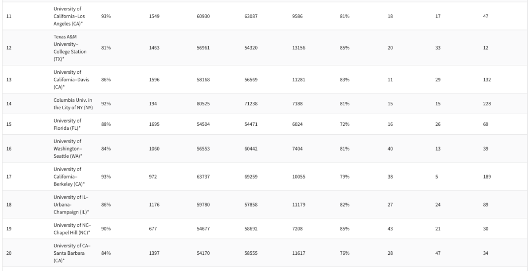 第13名是加州戴维斯;而它在US News中仅排名第39位。14名是哥大;15名是佛罗里达大学;