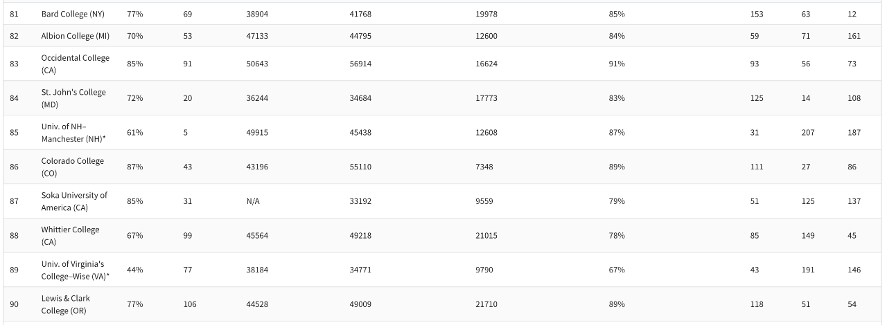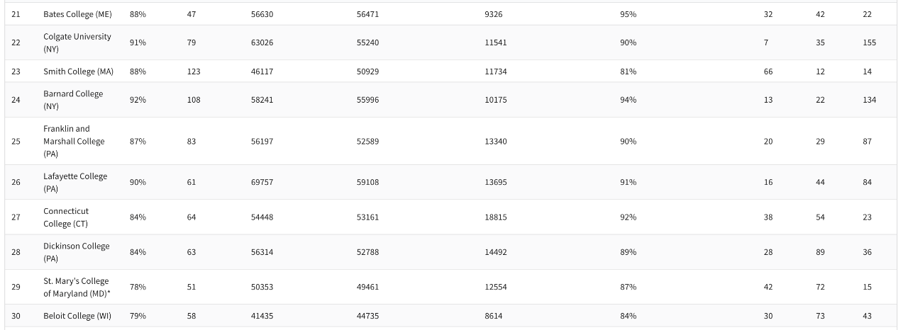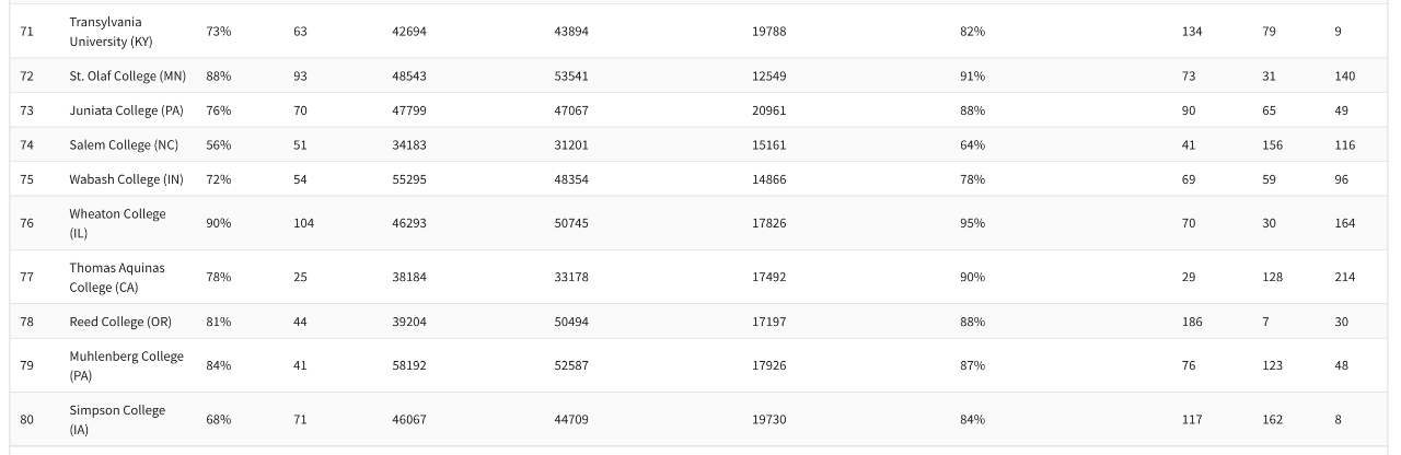 第一名是阿默斯特学院、第二名是卫斯理大学、第三名是伯利亚学院;《华盛顿月刊》把伯利亚学院排在第三位,因为提供低学费的优质教育,为低收入家庭的孩子获得高等教育提供了良好的机会。