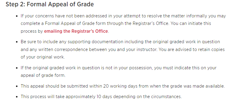在与任课老师沟通后,如果学生认定自己的成绩依然存在错误或者异议没有充分的解决,学生有权利提交正式的成绩申诉。关于成绩的申诉,学生需要在收到成绩后的20个工作日内提交至学校的Registrar‘s Office。学生应该在申诉中详细解释申诉的原因,与任课老师沟通的过程,以及提交相应的证据。在收到学生的成绩申诉后,学校通常会在10个工作日内做出答复。