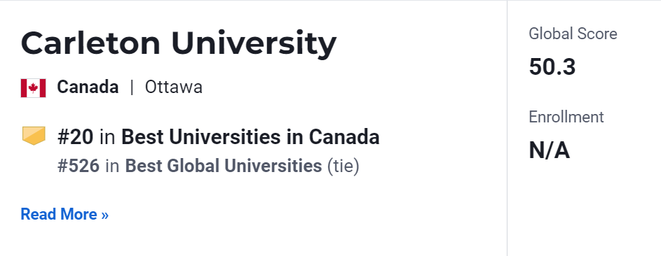 2024年USnews 加拿大大学排名中,Carleton University位于第20名。