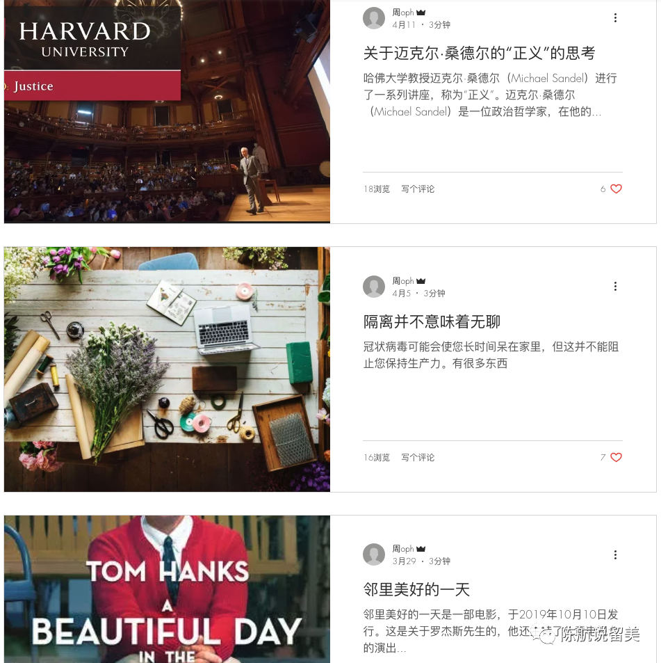 这是索菲亚的个人网站。她已经写了 46 篇文章,有读书笔记,有疫情在家随想,也有对哈佛大学教授桑德尔关于“正义”的思考。