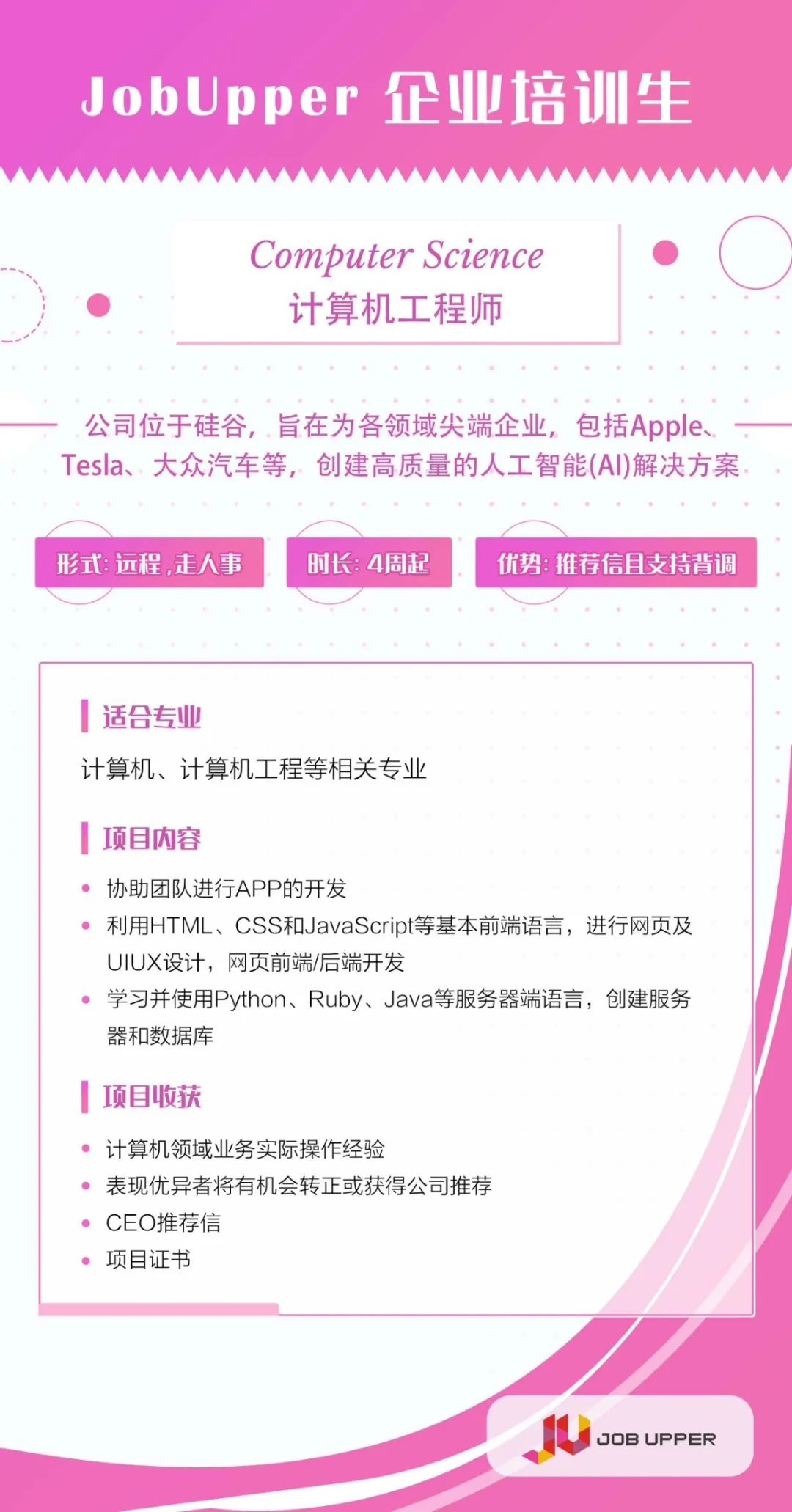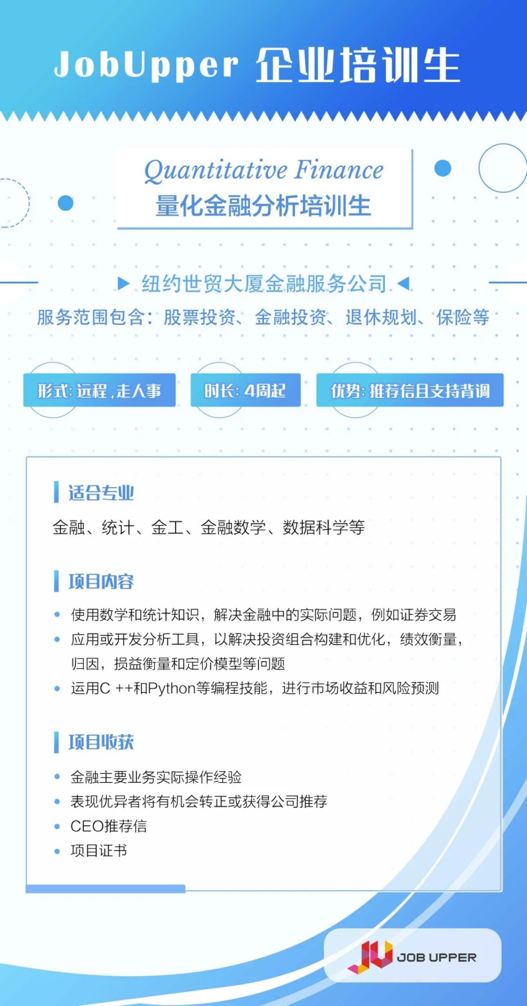 严峻就业形势下,是否可以考虑在美国开始一段专业实践经历!实践出真知,企业培训生项目向你招手。JobUpper带来位于金融中心【纽约】和科技中心【硅谷】专业实践机会!