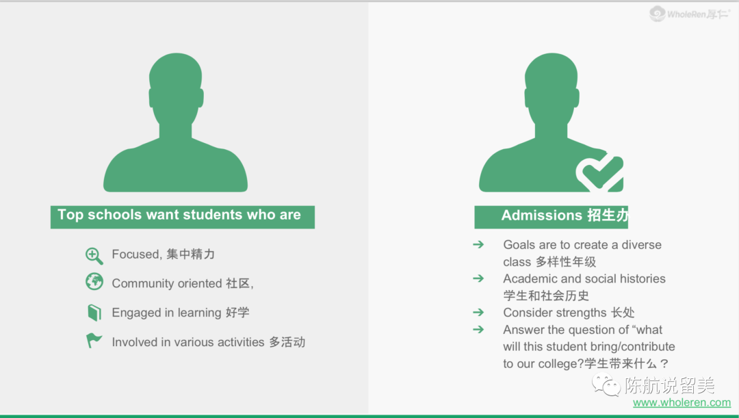 美国藤校如果要招100个学生,那么一定要尽最大努力找到100个不同的学生,而不是照着一个模子出来的学生。