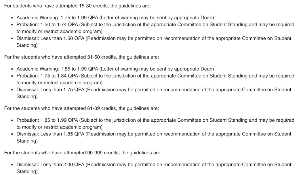 4. 对于注册了高于90个学分的学生GPA低于2.0将会被开除(Dismissal)。学生被开除后能否再次入学,将取决于学生常设委员会的建议。