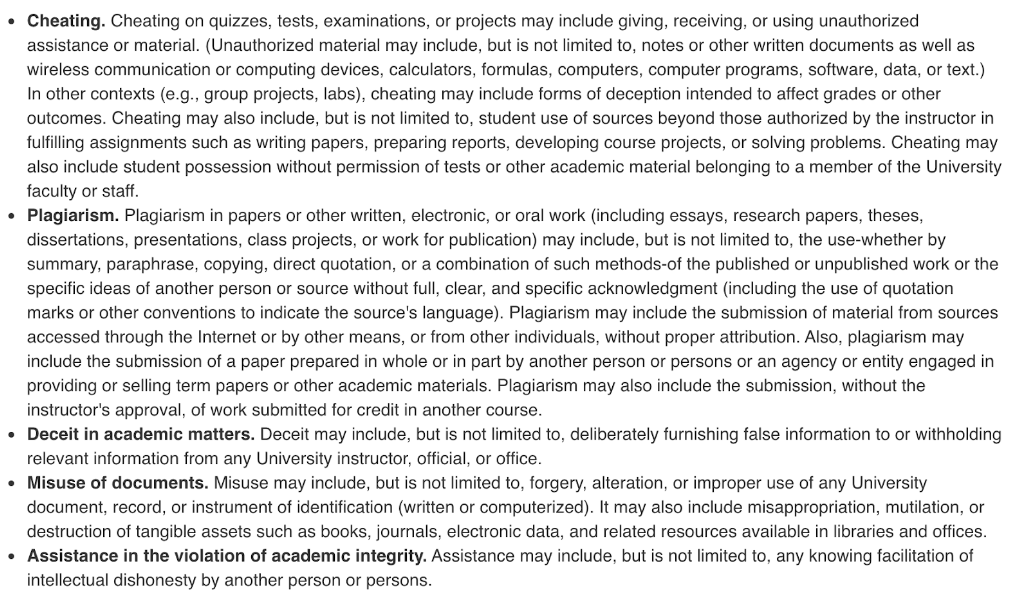 • 抄袭Plagiarism:抄袭论文,电子或口头作品(包括:文章,研究论文,演讲,课堂项目后已出版的作品);未经标注的情况下使用来自于网络或他人的资料;未经老师授权,在不同课程中提交同一份作业等
