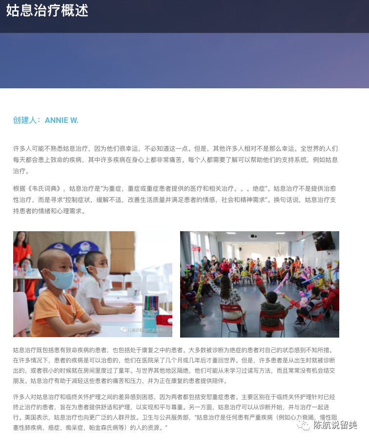 她从去年开始,就支持儿童舒缓治疗,在北京儿童舒缓治疗中心做了义工,然后今年,他们在美国创立了一个非盈利机构,全力支持中国和全世界的重病儿童。
