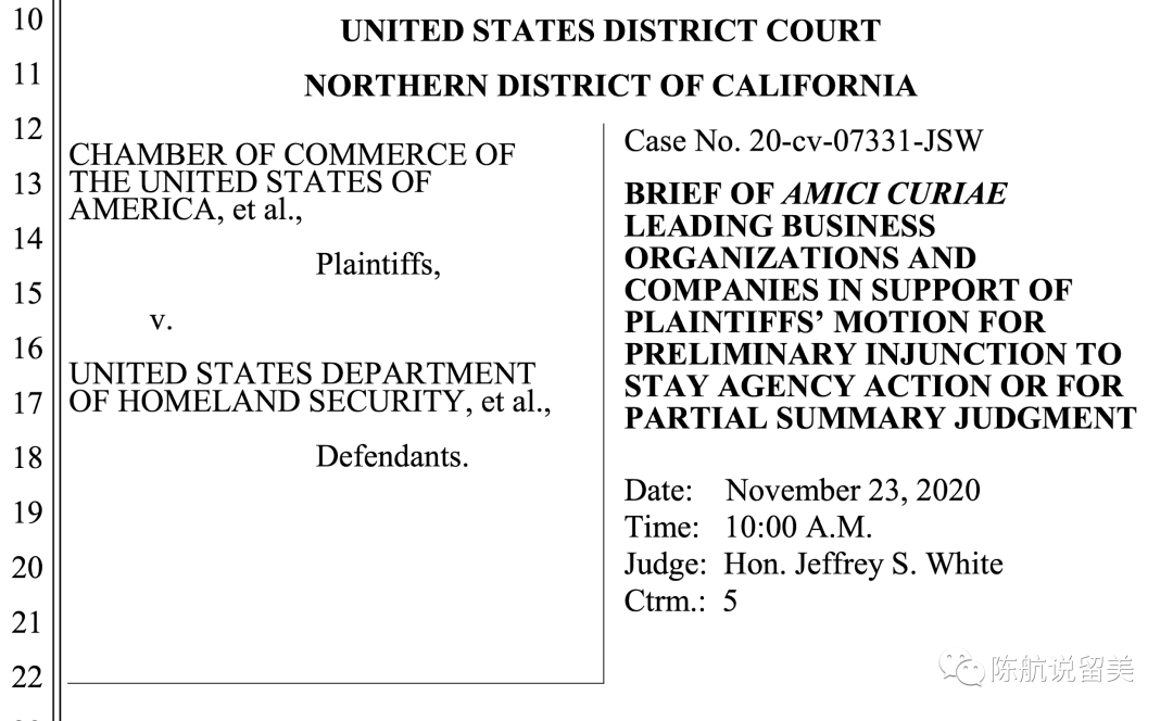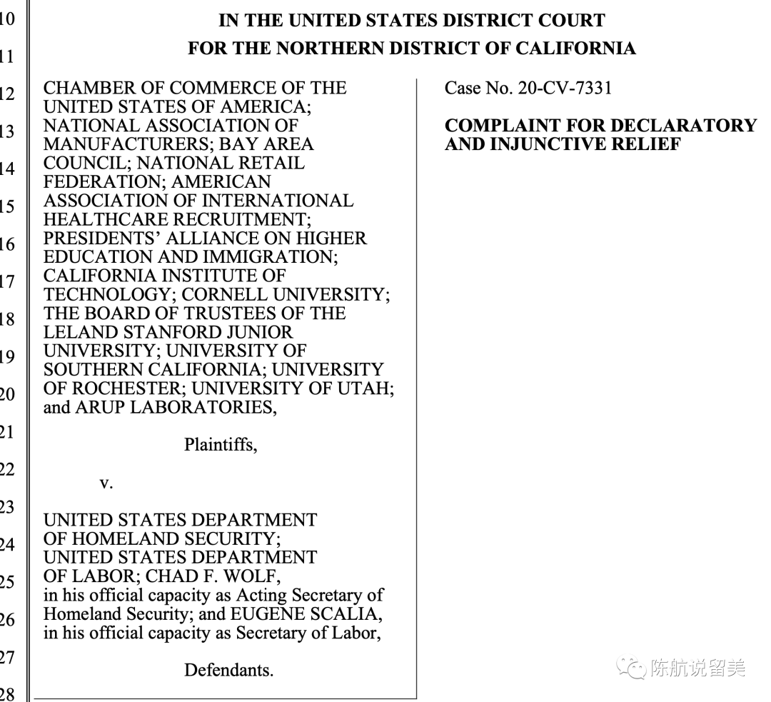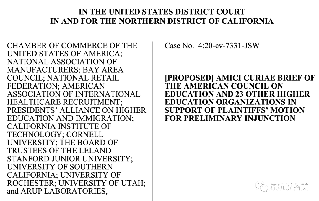 这个案子,由美国总商会提起,由 23 所大学给以最初的支持,包括加州理工,斯坦福,康奈尔大学等,状告美国国土安全局。