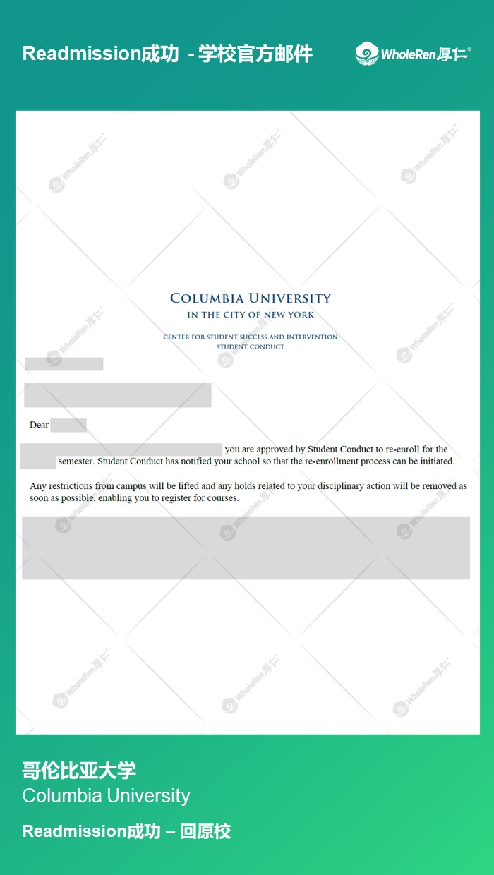 专家老师帮助学生合理规划停学期间的学业,并指导学生提升学术背景,准备Readmission的申请材料和文书,最终顺利返回原校继续学业。