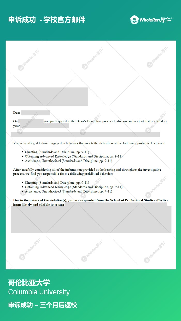专家老师在了解学生情况后,指导学生解释考前复习以及考试的经过,证明自己没有作弊的动机,最终申诉成功,学生三个月后返校。