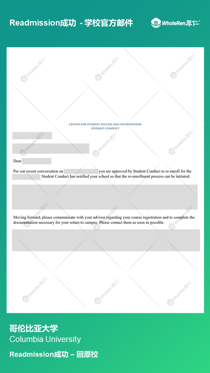 专家老师在了解学生的情况后,指导学生合理规划停学期间的学业,指导学生准备Readmission申请,最终顺利返回原校。